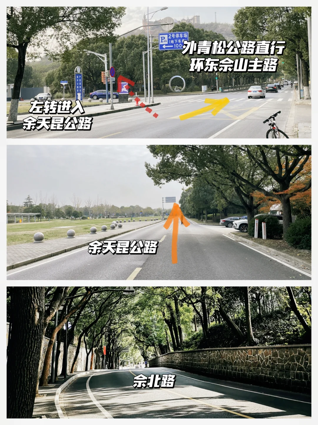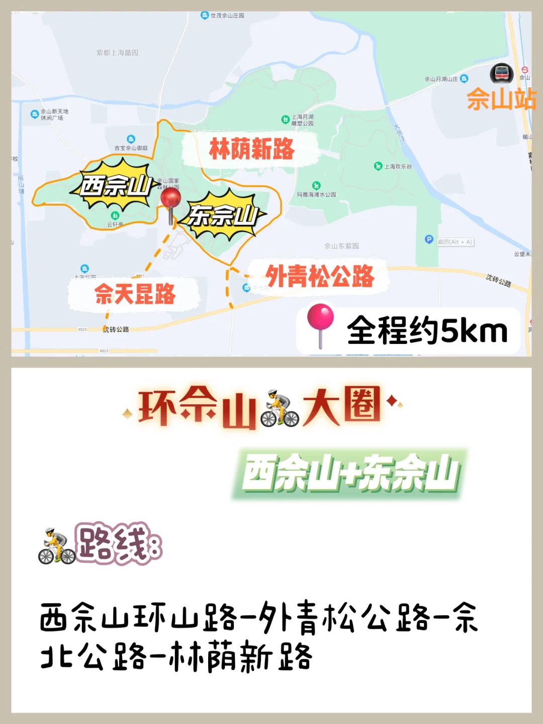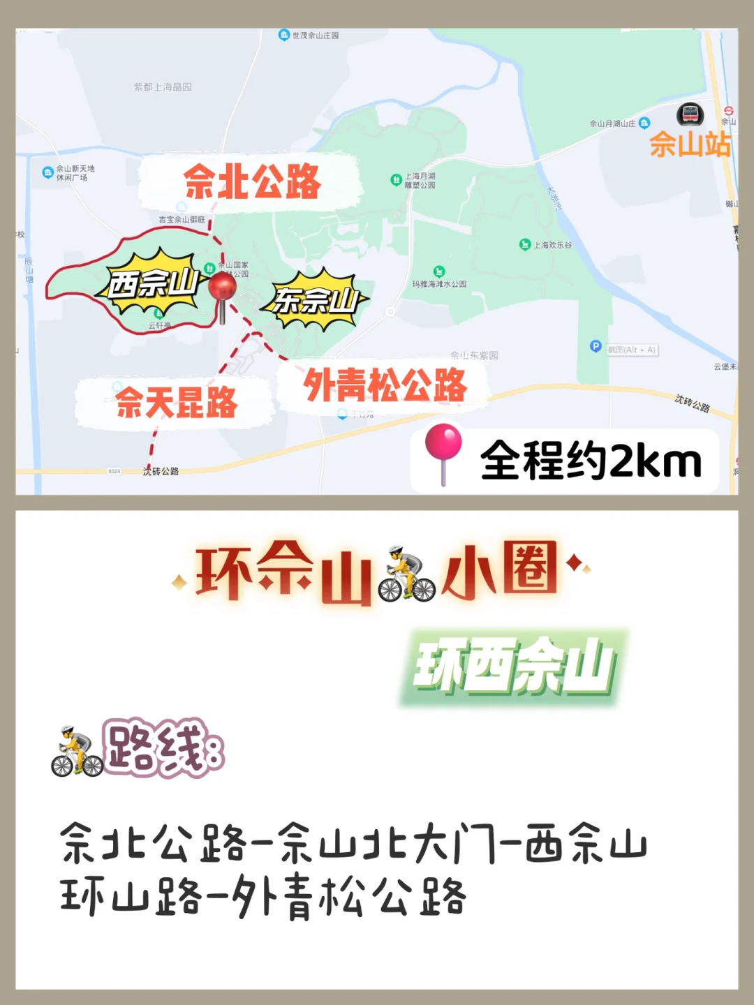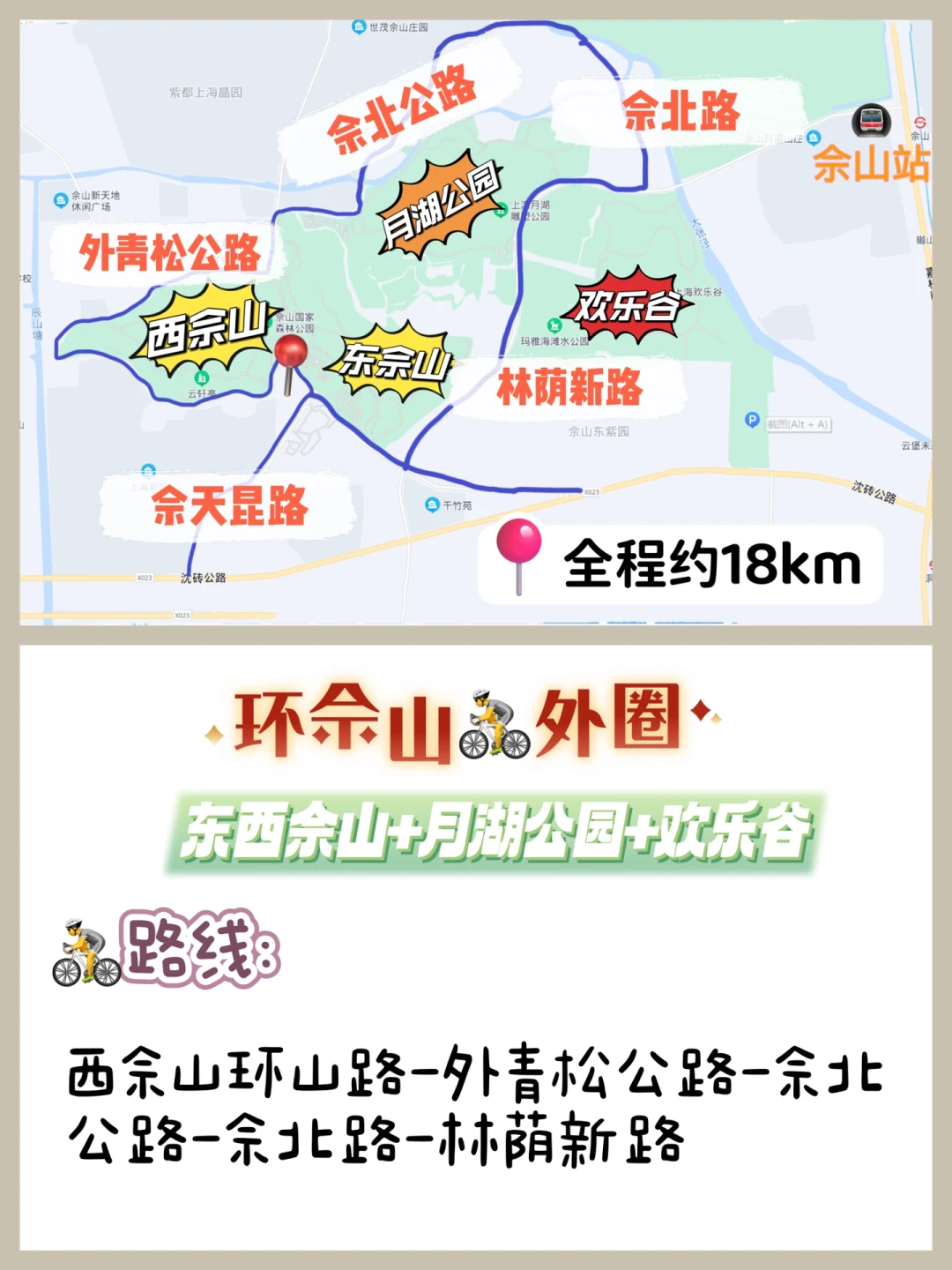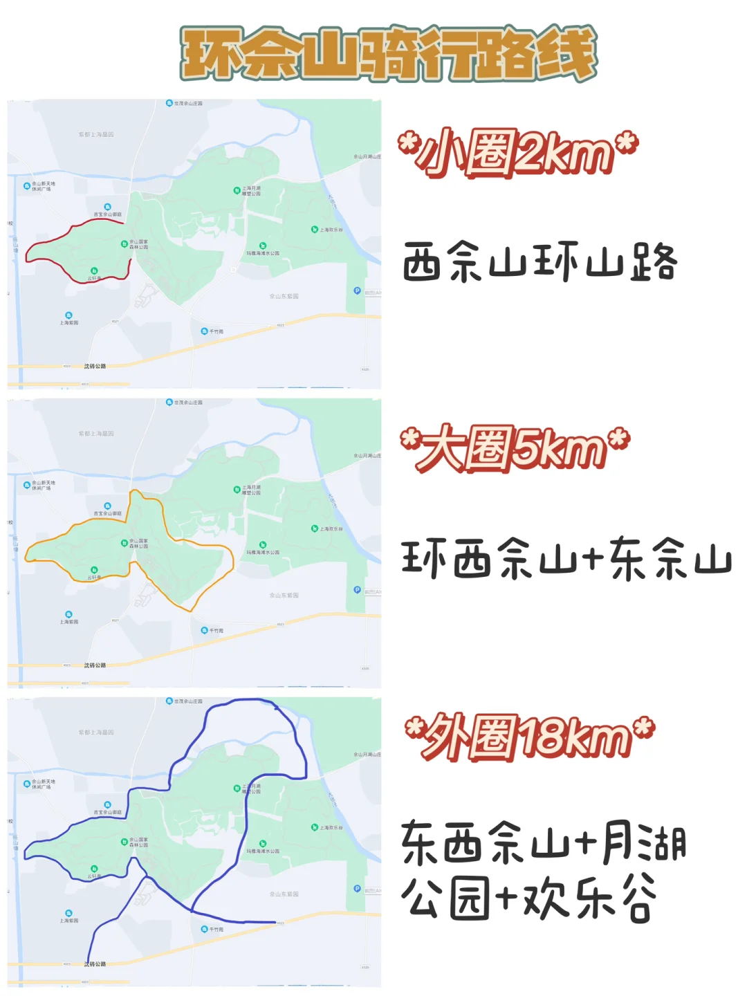 一个更完整的大圈,全程约18km,适合成人公路骑行,沿途能打卡几乎所有佘山标准景观。
