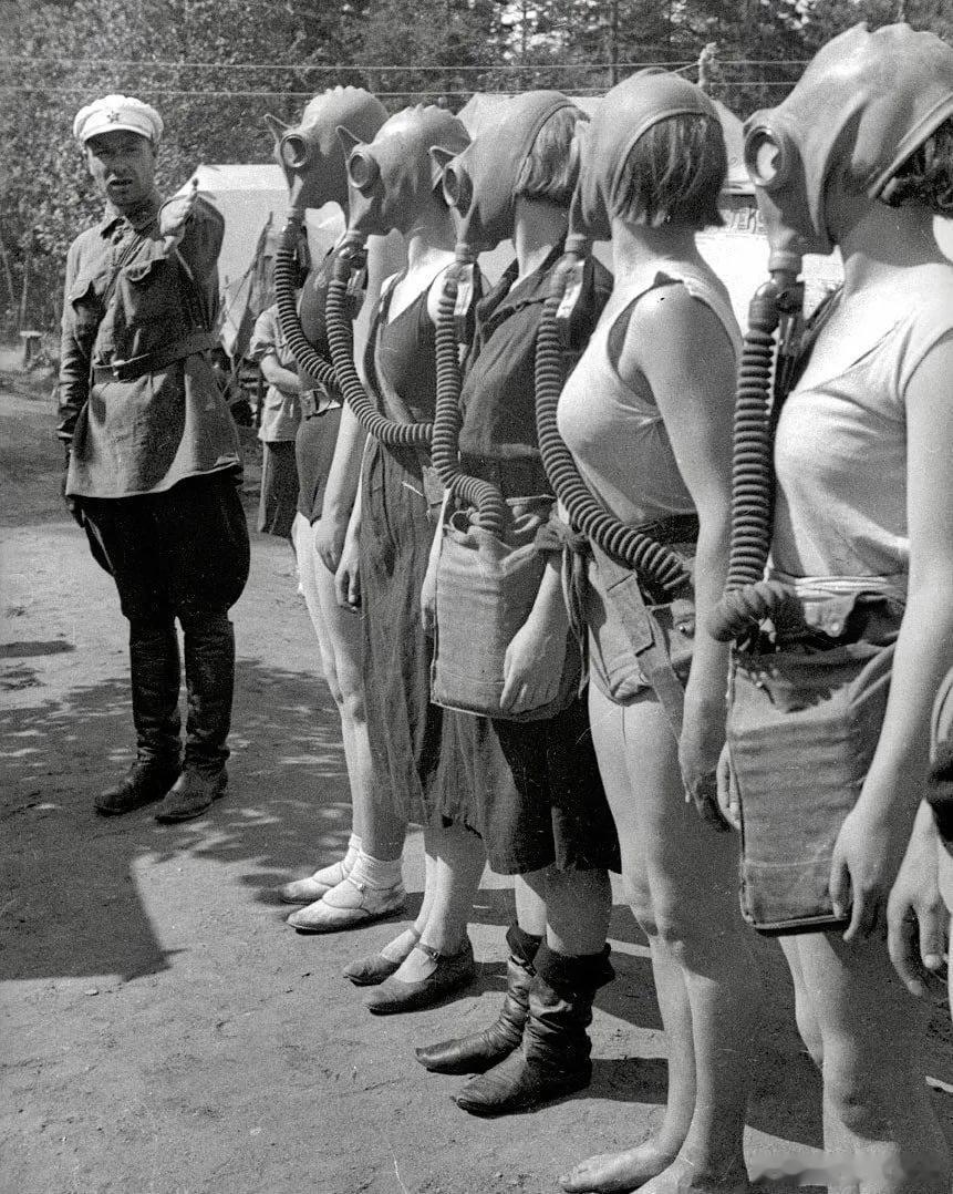 苏维埃大妹的三防训练这张照片记录了 1930 年代苏联“Осоавиахим”(Osoaviakhim)民防训练演习的场景,由著名纪实摄影师埃马努伊尔·叶夫泽里欣(Emmanuil Yevzerikhin)拍摄。Osoaviakhim 是“苏联国防、航空与化学建设促进会”的简称,它拥有航空俱乐部、射击场、跳伞塔等设施,是当时苏联最大规模的群众国防与军事技术组织,到 1930 年代末会员超过 1 300 万。照片所反映的正是该组织在战争威胁加剧背景下,对平民进行防化、防空与应急疏散演练的历史瞬间 。估计是拉了一个紧急集合。带劲!海外新鲜事热点观点历史知识共产主义视觉形象