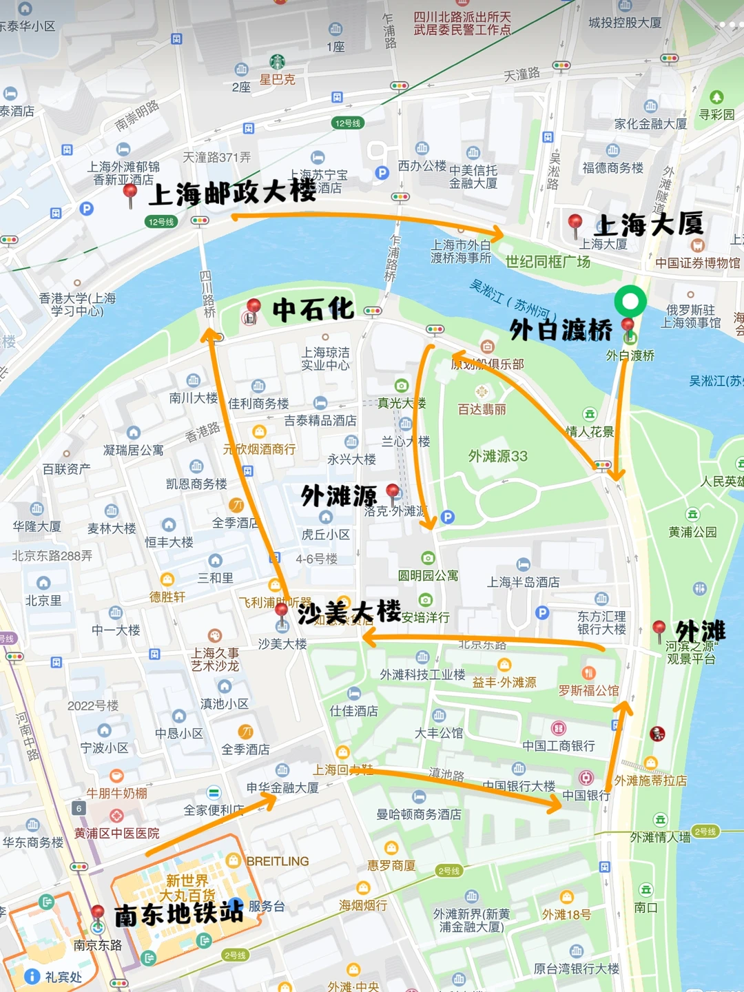 🗺️路线:滇池路→外滩→北京东路→沙美大楼→四川中路→上海邮政大楼→北苏州河畔→乍浦路桥→上海大厦→外白渡桥→圆明园路