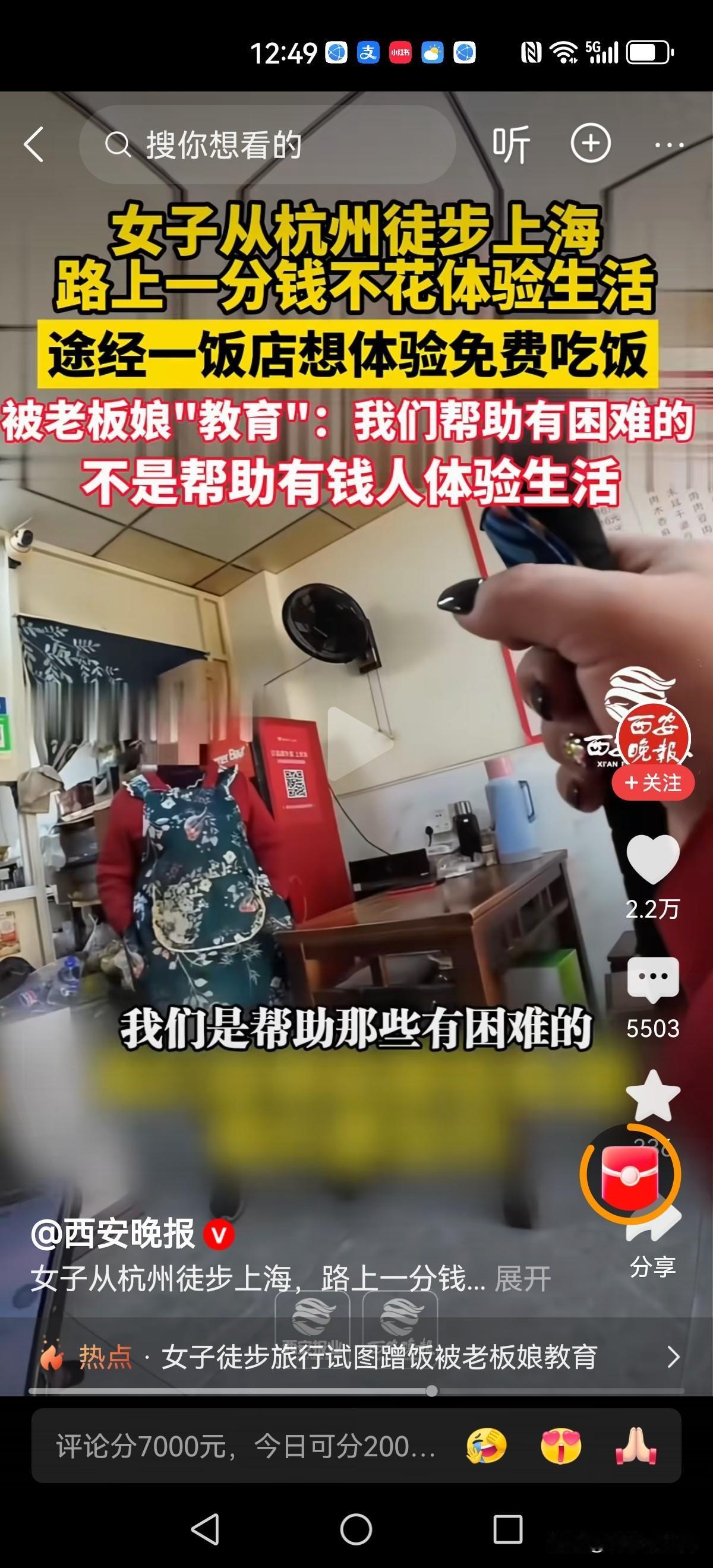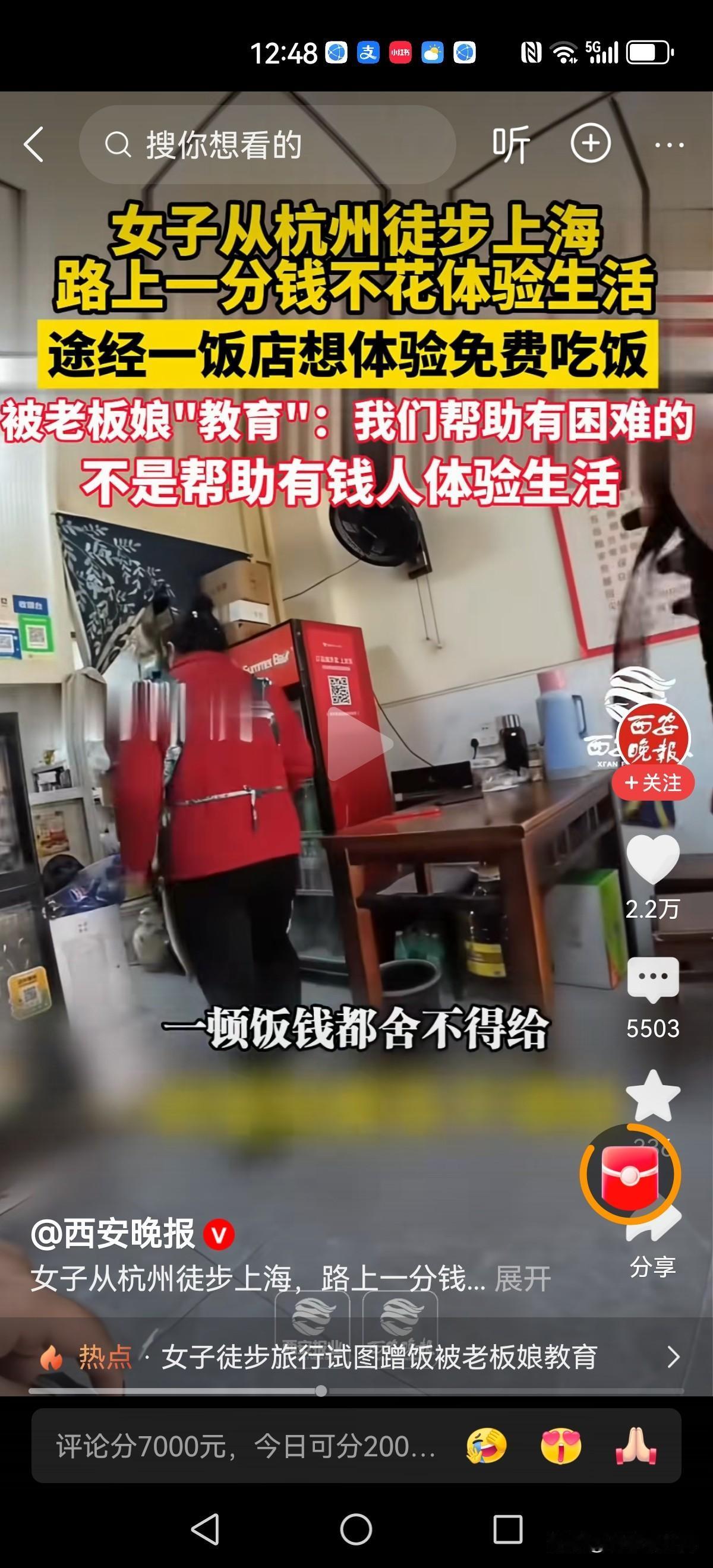 拒绝得干脆利落! 女子从杭州徒步走去上海,路上一分钱不花体验生活。 途经一饭店想要免费吃饭。得知情况的餐馆大姐果断拒绝了女子的不情之请。 “我们只帮助有实际困难的人免费吃饭,不会帮助有钱人体验生活”! 是啊,你有钱又有闲的,一顿饭钱都不想掏。人家烟熏火燎地开个饭店容易吗? 真想体验生活免费吃饭的话,那你就跟饭店说好吃完饭帮忙收拾碗筷打扫卫生免费打短工半天。 有付出才有回报,一分耕耘一分收获。这,才是生活!女游客徒步 杭州徒步 上海人徒步西藏 上海女生旅行 上海热心女士 上海杭州旅游 上海城市徒步 上海徒步爬山 上海徒步苏州