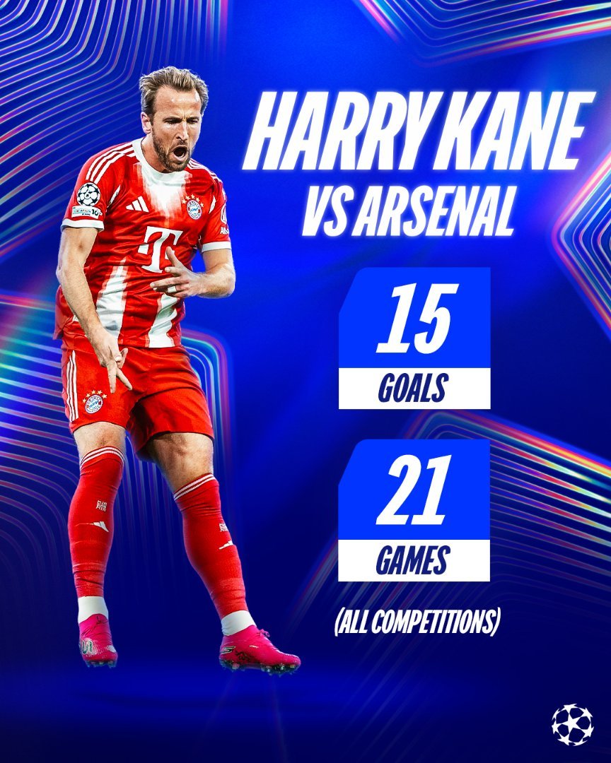 哈里·凯恩在对阵阿森纳的21场正式比赛中攻入15球。在酋长球场的10次比赛中,他6次攻破阿森纳球门的,这使他成为该球场历史上进球最多的客队球员。[Bayern & Germany]