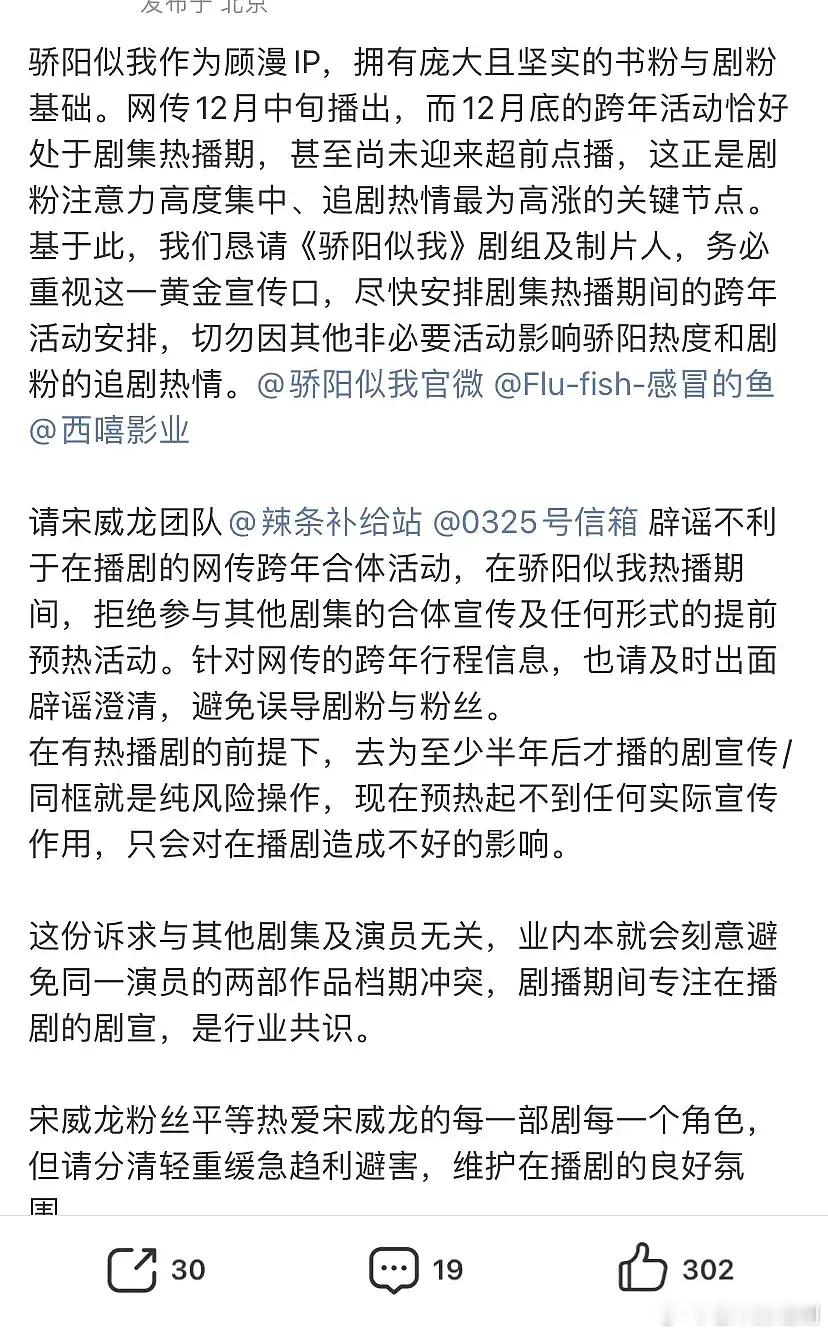 宋威龙粉丝拒绝和张婧仪《野狗骨头》芒果台跨年合体,理由是不想影响和赵今麦《骄阳似我》热度和追剧热情
