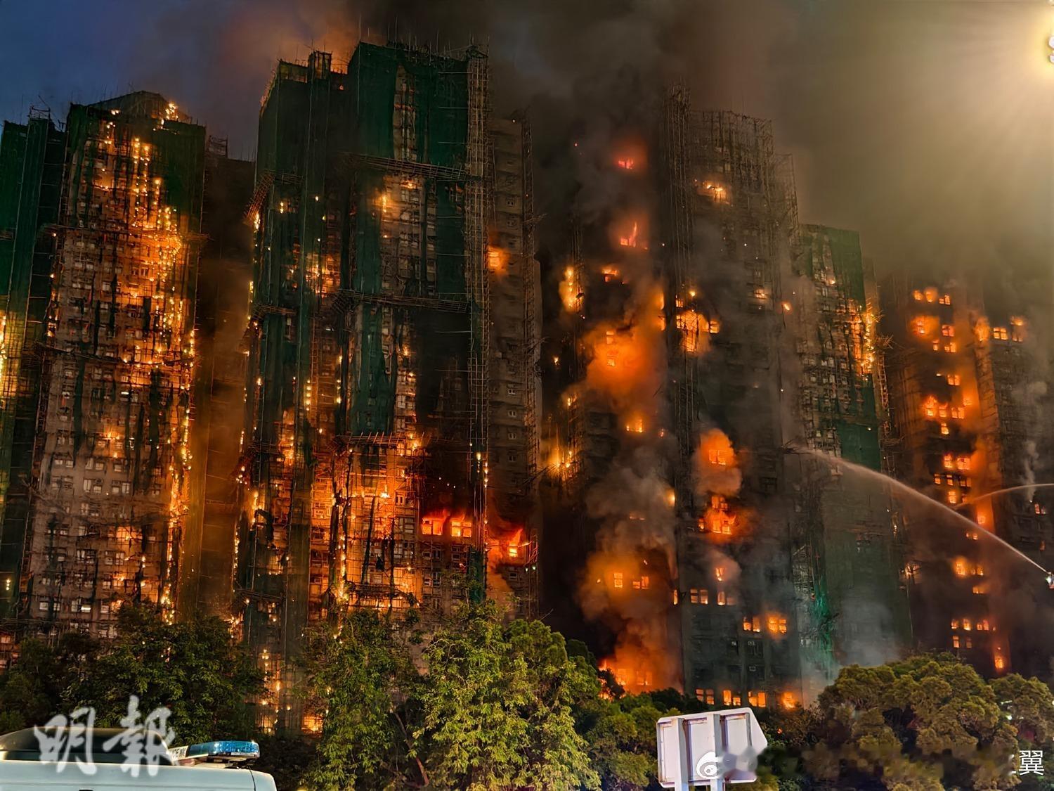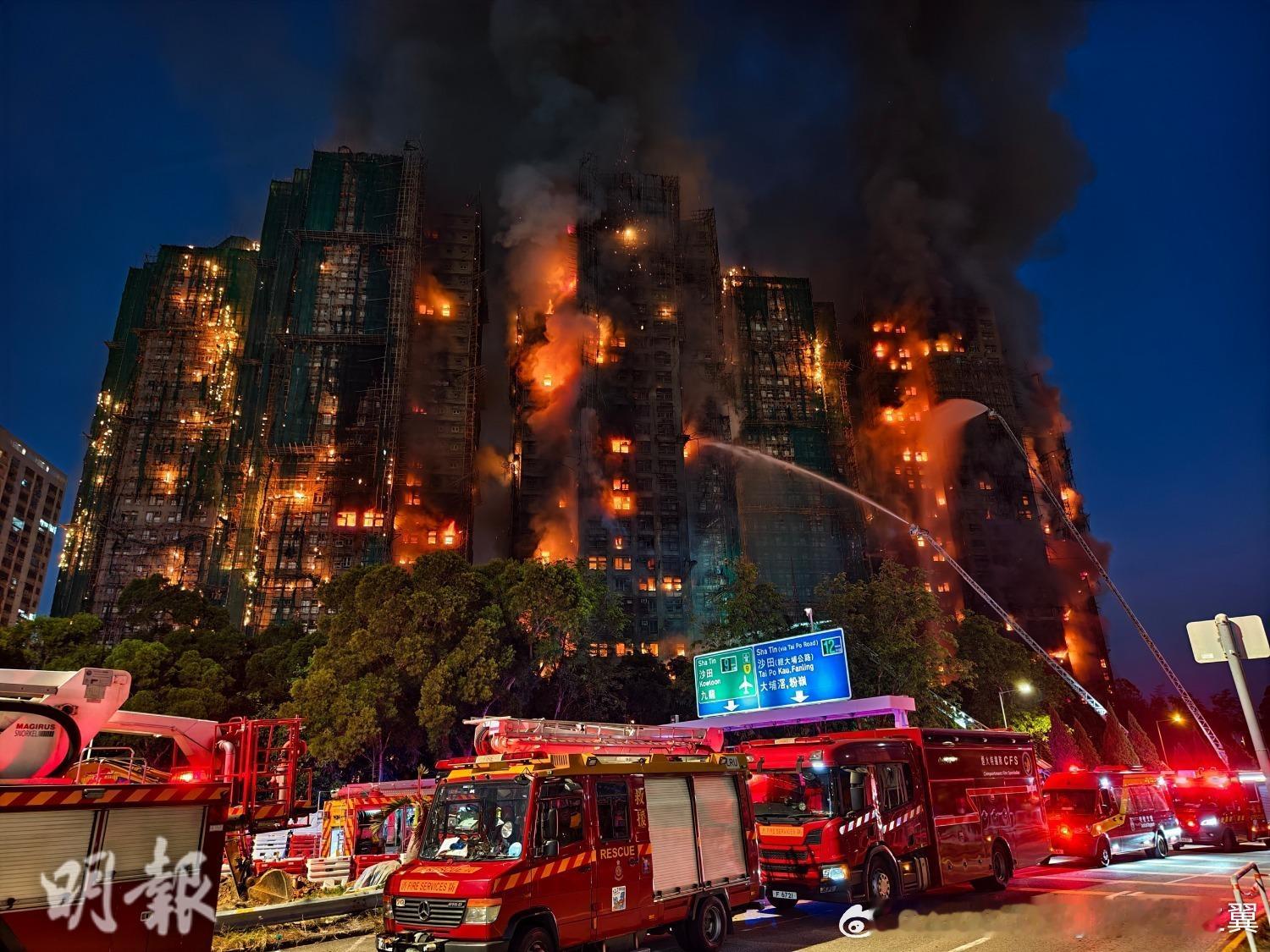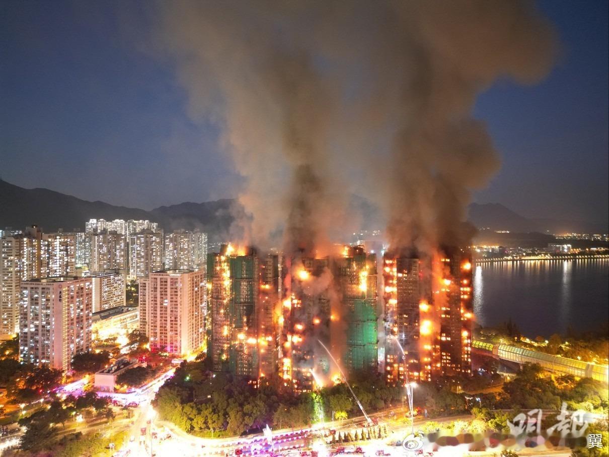 大埔宏福苑大火入夜情况。香港火灾 香港火灾升至五级 火势已经蔓延开,成为香港历史