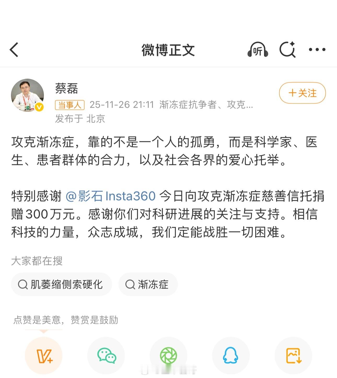 蔡磊感谢影石捐款300万元当冰封的生命遇上滚烫的善意,300万捐款是给渐冻症斗士