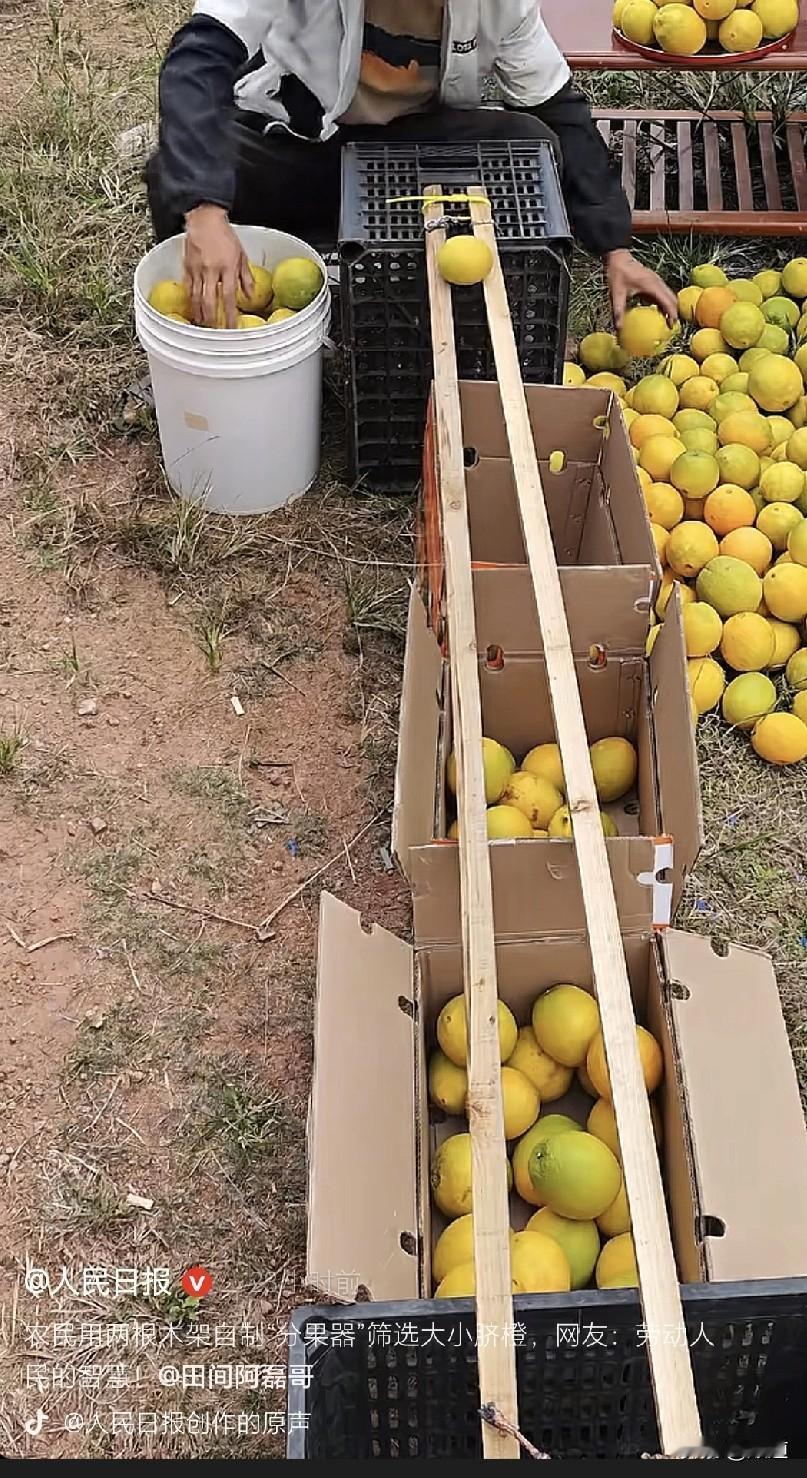 赣南脐橙分拣器就这么简单做成了,只用两根竹蔑,八字摆放。 将橙子顺一头一放,小的先掉下去了,二等大的中间掉下去,最大的最后掉下去。 这可比肉眼分拣标准多了。 哈哈,只要用心生活,行行都有发明家。