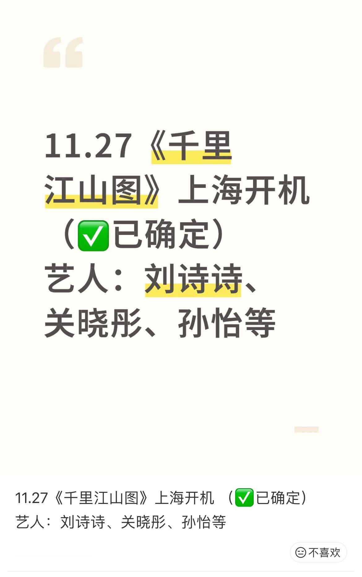 🍉11.27日,刘诗诗,关晓彤,孙怡等《千里江山图》上海开机