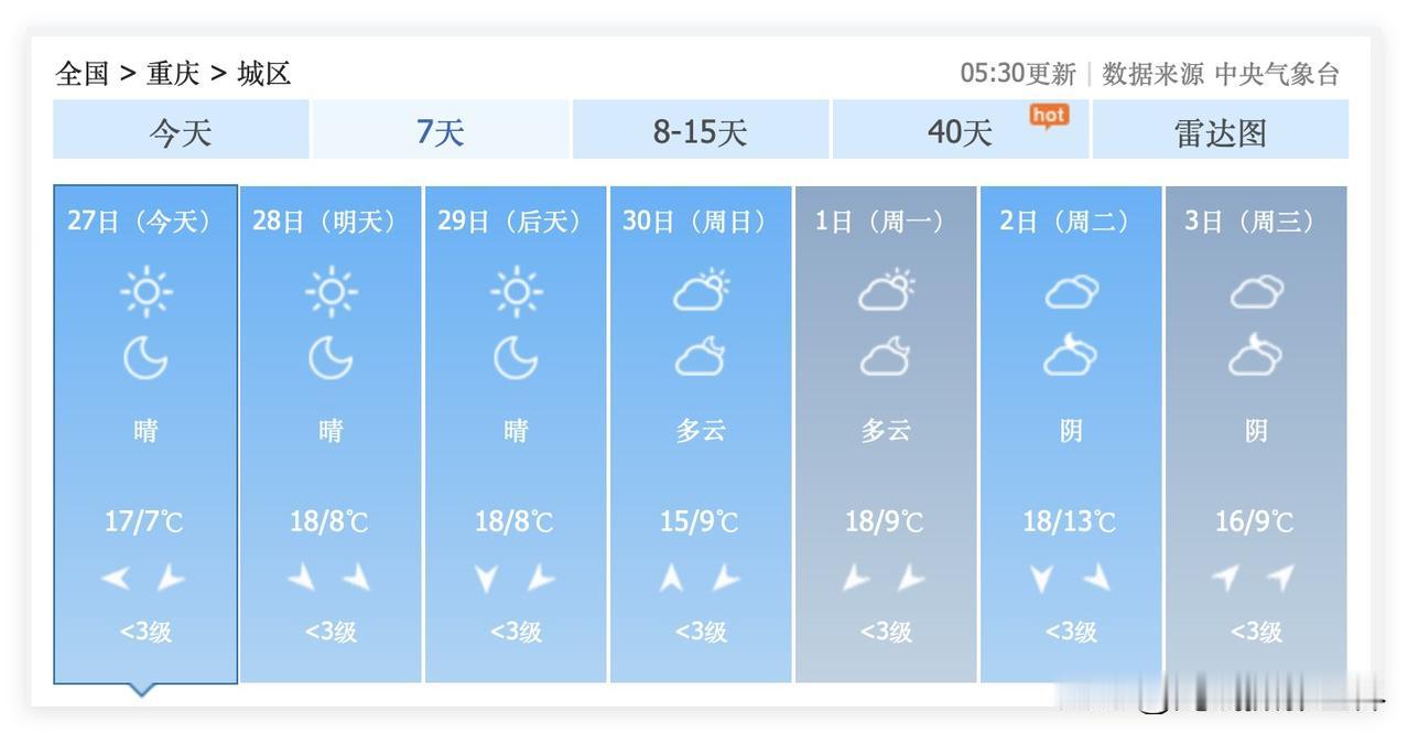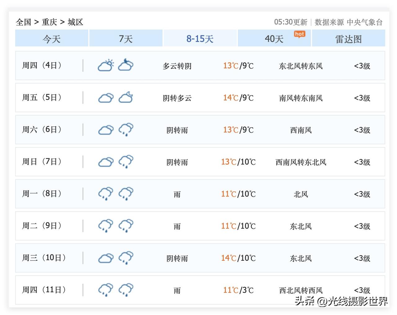 噢!12月2日开始,重庆主城区的超级好天气,就要告一个段落啦!大家好好珍惜11月27日到30日的重庆好天气吧!这对于秋冬季的重庆来说,真的是特别难得啊!