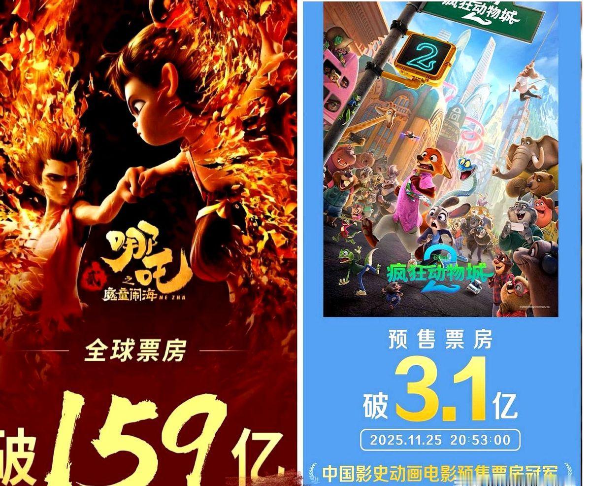 《疯狂动物城2》一来就破了《哪吒》纪录。 这势头真猛。11月25号上映,选的还是个工作日,预售就干到了3.1亿,直接把《哪吒》之前的预售纪录给破了。首映当天更是冲破3.3亿。这可不是春节假期档,这数据含金量真的高。 另一边,《哪吒2》也不是吃素的。总票房已经破了159亿,稳稳的第一。想想第一部《哪吒》才50多亿,续集票房直接翻了2倍还多,国产IP这爆发力,太吓人了,真的太吓人了。 这俩片子打法完全不一样。《疯狂动物城》靠的是全球IP和好莱坞的工业制作,第一部就攒了超多粉。而《哪吒》主打一个文化共鸣,观众调查都说《哪吒2》的二刷率更高,粉丝黏性强。 业内分析《疯狂动物城2》要是保持这劲头,总票房冲个80亿不是问题。但要撼动《哪吒2》的159亿纪录,还是有点难。口碑,真的很重要。 一个是国产崛起,一个是国际大厂,这不光是票房数字的较量,也是两种创作路子的对决。