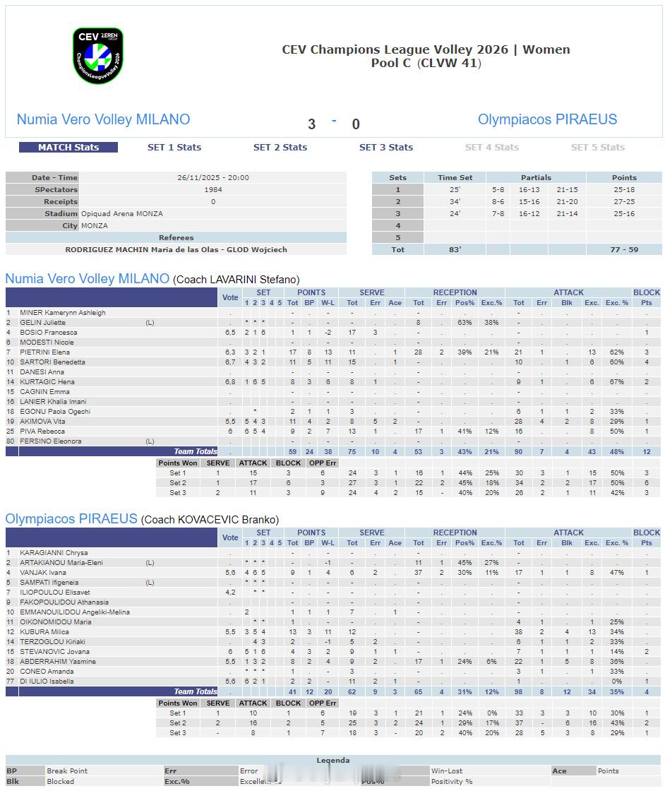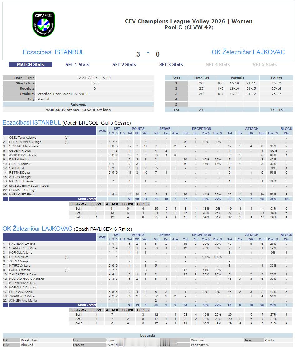 【欧冠女排伊萨横扫取开门红 米兰零封奥林匹亚科斯】国际排坛战报速递 11月26日,欧冠女排第四轮首回合,C组土耳其伊萨奇巴希主场3-0(25-12/25-16/25-17)横扫塞尔维亚泽莱兹尼卡。卡拉库尔特14分、斯蒂西亚克和MVP杰克-基萨尔各12分、雷特克11分,客队得分最高的菲利波维奇7分;意大利米兰主场3-0(25-18/27-25/25-16)零封希腊奥林匹亚科斯。MVP皮耶特里尼17分、萨托里和阿基莫娃各11分,库布拉13分。
