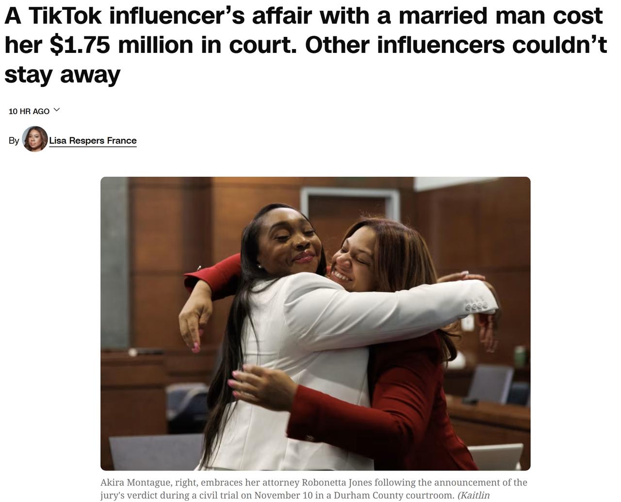 美国抖音女网红与有妇之夫搞婚外情被法院判罚175万美元 美国北卡罗来纳州的Montague,是一位27岁的两个孩子的母亲,本月赢得了一项175万美元的判决,她控告TikTok网红Brenay Kennard,指控其与前夫Tim Montague有婚外情。北卡罗来纳州陪审团认定Brenay Kennard破坏婚姻并发生通奸性行为——需承担责任。被判处以罚金175万美元。 除了北卡罗来纳州,美国目前还有其他五个州仍可起诉第三方违反婚姻,如果即破坏婚姻并发生通奸性行为,需要承担法律责任。
