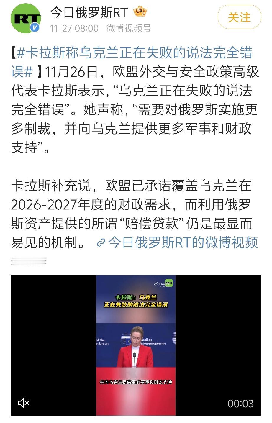 据俄媒的说法,卡拉斯声称要限制俄罗斯军队规模和国防预算,她坚称乌克兰没有走向失败,还宣布欧盟会出面负责乌克兰下一财年的财政需求。但这有两个需要解释的问题,一个是欧盟的钱是哪来的呢?一个是,欧盟是不是在阻挠俄乌挺火?不过俄罗斯可能并不在乎卡拉斯的说辞,反而特朗普大概率会很生气——感恩节达成和平协议的可能已经无限趋近于零。