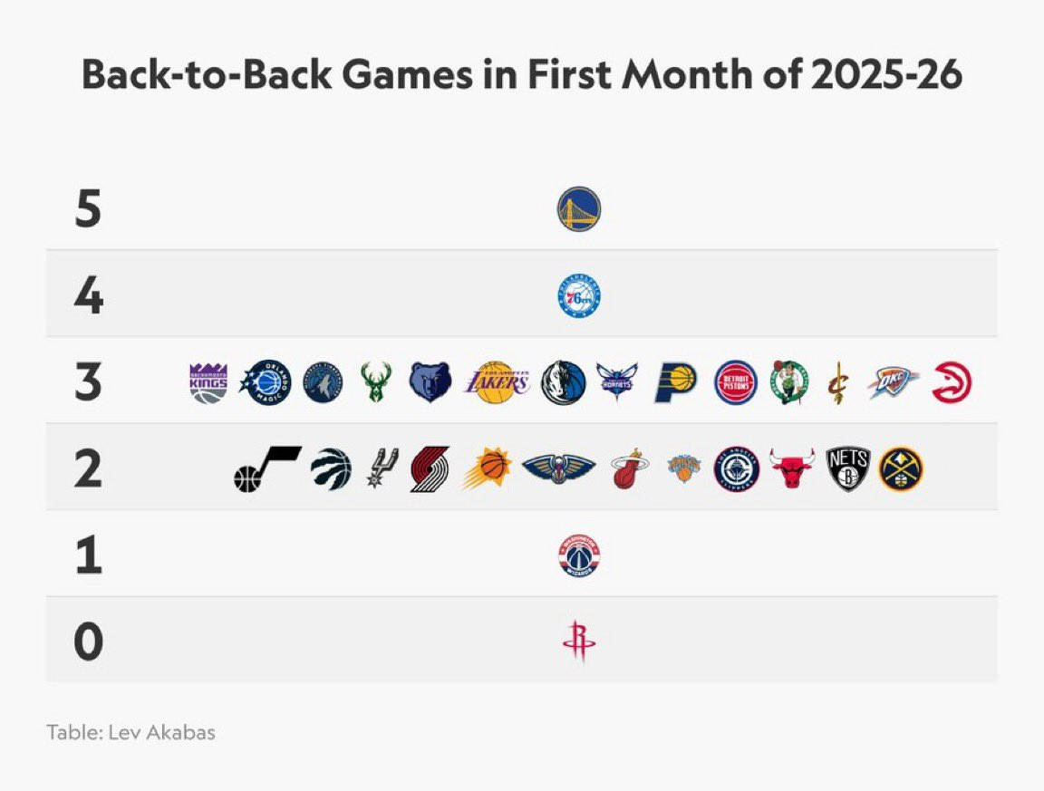 本赛季目前联盟背靠背情况,我勇独领风骚,火箭赛程最好。nba常规赛