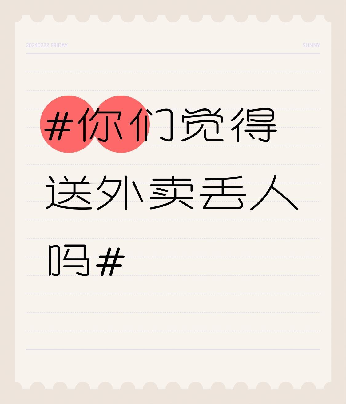 送外卖丢人吗?世俗眼光里,写字楼的白领敲着键盘,外卖员却在街头风吹雨淋,好像外卖这份工作“低人一等”。有大学生毕业后送外卖,亲戚朋友都觉得他“没出息”。 但我觉得送外卖一点不丢人!他们是城市“骑士”,风里来雨里去,为大家及时送上美食。大城市每天数百万单外卖,背后是他们的辛勤付出。有下岗大哥为养家送外卖,早出晚归让家人生活稳定。他说得好,靠双手挣钱不丢人!每份工作都有价值,都值得尊重,送外卖同样光荣。