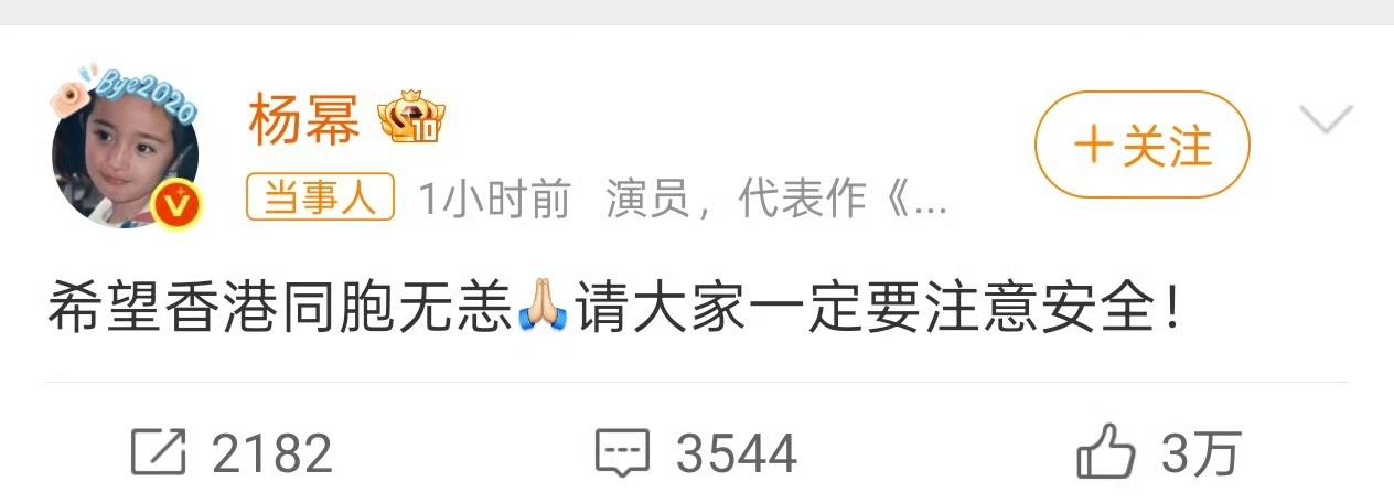 群星同心祈福香港!每份牵挂都藏着家国暖意 今早杨幂一句“愿香港同胞无恙,务必注意安全”戳中人心,其实早已有一大波艺人默默为香港揪心祈福。从惠英红、赵雅芝等前辈到蔡卓妍、谢霆锋等实力派,再到宋雨琦这样的新生代,不分地域不分资历,字字恳切满是牵挂。星光不分远近,家国同心同行,愿风雨早散,香港平安顺遂,同胞皆安。