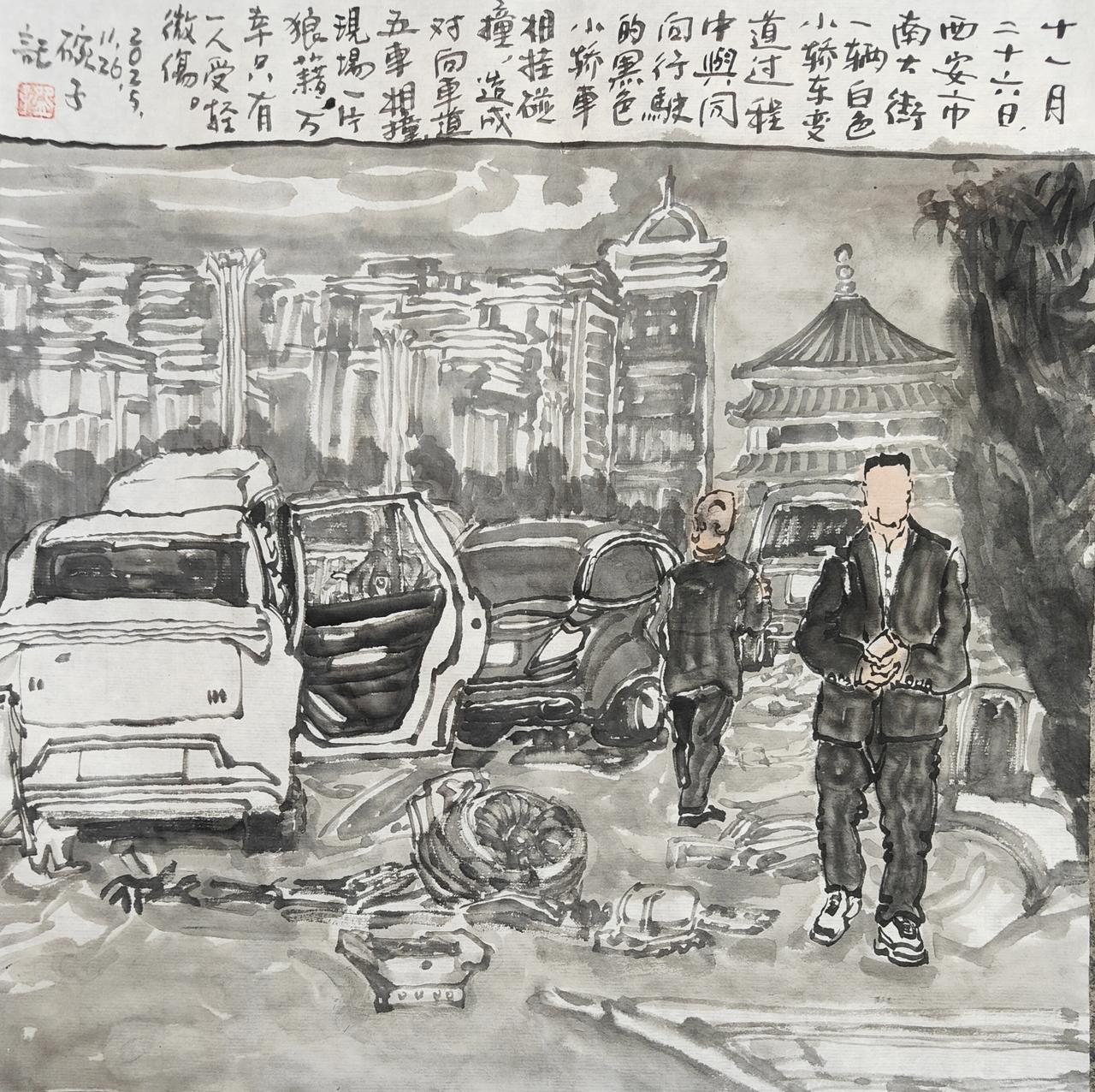 2025碗子记事:11月26日,西安市南大街一辆白色小轿车变道过程中与同向行驶的黑色小轿车相挂碰撞,造成对向车道5车相撞,现场一片狼藉,万幸只有一人受轻微伤。2025.11.26.碗子记之
