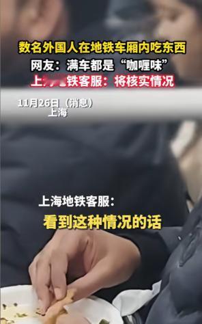 滚回自己的国家!近日,上海,地铁上出现一群外籍人士,他们竟然在车厢内拿着盘子吃起了手抓咖喱饭!周围的空气瞬间弥漫着难闻的味道,旁边的乘客只能捂紧自己的口鼻,不满地看着他们。网友:太没素质了! 11月26日的上海,早高峰的地铁里挤满了赶时间的乘客。 车厢内人挨着人,空间格外狭小,每个人呼吸都得小心翼翼,大家都在拥挤中默默忍受着通勤的不便。 就在这样的环境里,几名外籍人士的举动打破了车厢内的平静,也让周围乘客的眉头紧紧皱了起来。 这些外籍人士手里都端着盘子,里面装着两类食物,有的是咖喱饭,有的是咖喱味的馅饼。 他们没有顾及周围拥挤的人群,直接用手抓起食物往嘴里送,期间还互相递让分享,不少人的手上都沾着黄糊糊的酱汁。 食物散发的刺鼻气味很快在封闭的车厢里弥漫开来,周围的乘客纷纷下意识地捂住鼻子,有人特意往旁边避让,还有一些人因为气味太过浓烈,出现了头晕恶心的反应。 但这些外籍人士似乎完全没有察觉到周围人的不适,依旧自顾自地吃着,脸上没有丝毫在意的神情。 一名乘客用手机记录下了这一幕,视频被发布到网络后,迅速引起了大量网友的关注和讨论。 网友们的留言里,满是对这种行为的不解和不满,有人直言“满车都是‘咖喱味’,这哪里是地铁,简直成了他们的餐桌”,还有人对比自己在地铁里连喝水都格外谨慎,实在无法接受这样公然进食的行为。 不过,讨论中也出现了不同的声音,有一部分人认为,这种行为和国籍没有关系,本质上是公共意识不足的表现,不管是谁在地铁里吃气味浓重的食物都不合适; 还有少数人猜测,或许这些外籍人士并不了解地铁里的相关规定,适当提醒一下就好,没必要过度指责。 同时,也有网友反驳了所谓的“文化差异”说法,认为尊重是相互的,既然踏入了公共空间,就应该遵守当地的规则,这并不是针对某一类人的要求。 针对网络上的热议,上海地铁的客服和相关工作人员先后做出了回应。 他们明确表示,地铁车厢内一律不允许饮食,这是早就公布的规定,目的是为了保障每一位乘客的乘车体验,让大家都能在整洁舒适的环境里出行。 对于这次事件的发生,工作人员解释,主要是因为当时车厢内没有工作人员及时巡视,才导致这种情况没有被及时制止,属于监管环节的疏忽。 同时,地铁方面也给出了具体的反馈方式,告诉乘客如果遇到类似情况,可以直接向车站的工作人员反映,或者拨打专门的热线电话,他们会对相关情况进行核实和处理。 此外,上海地铁还提到,已经着手核实当时涉事的具体线路,后续会进一步加强车厢内的监管力度,增加巡视的频次,避免类似的事情再次发生。 在公共空间里,每一个人的行为都可能影响到其他人。 地铁作为大家日常出行的重要交通工具,需要所有乘客共同维护乘车环境。 不管来自哪个国家、有着怎样的背景,进入公共空间后,遵守共同的公共秩序都是基本的要求。 这种要求不是对某一类人的限制,而是为了让更多人能够在舒适、有序的环境中出行,这一点对每一个乘客来说都是一样的。 乘客们遇到不文明行为时,通过合理的方式反馈和处理,地铁方面也不断完善监管措施,才能让公共出行环境变得更好,让每一次通勤都能少一些不必要的困扰。 今天的分享到这里就结束了,大家对此事有何看法,欢迎在评论区留言和讨论,感兴趣的可以点击头像加关注,我将每日更新优质内容,我们下期见。