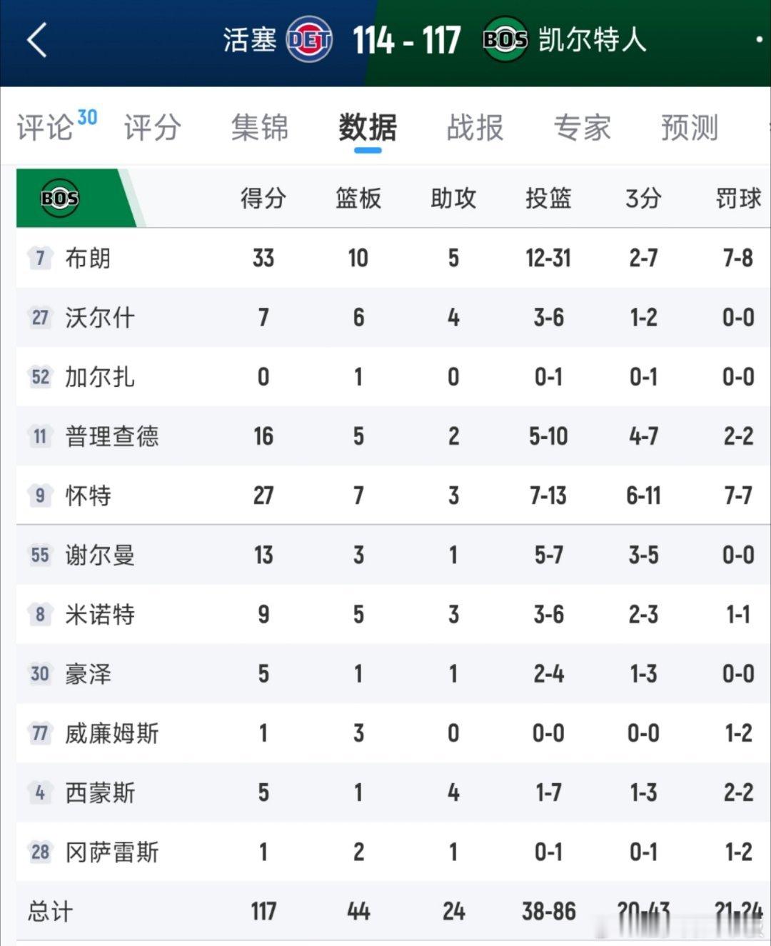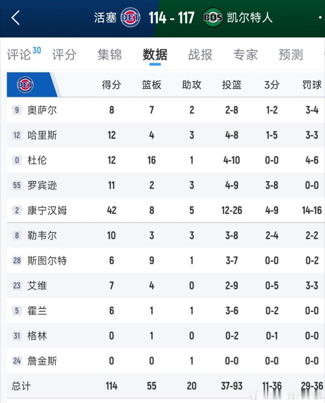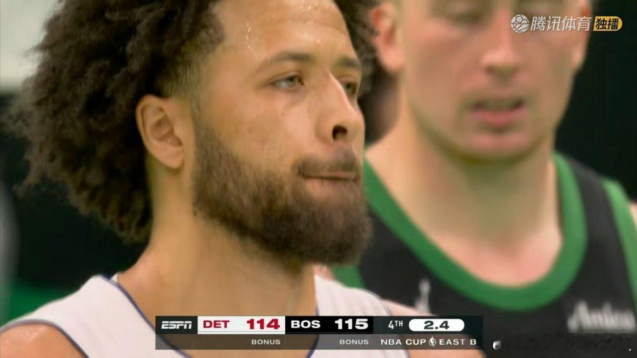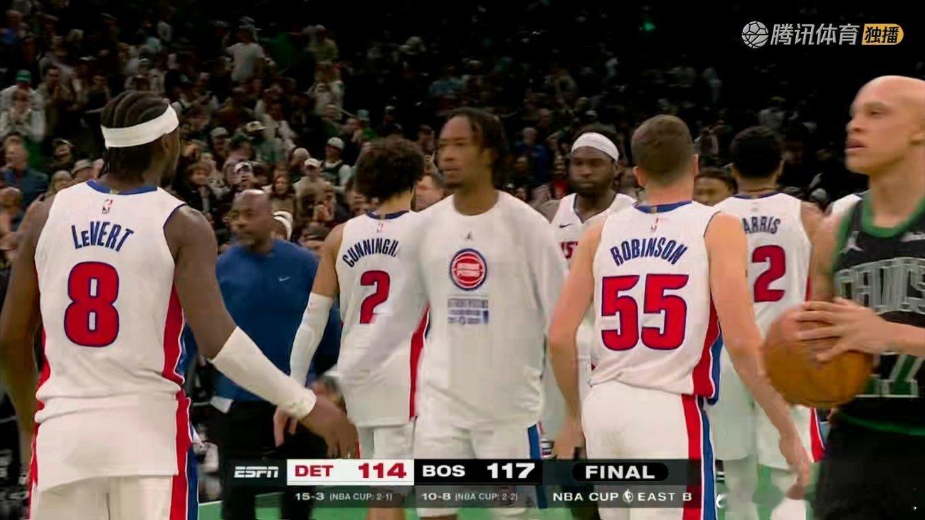 坎宁安错失关键罚球!活塞客场114-117不敌凯尔特人,13连胜被终结!坎宁安42分8板5助,杰伦-布朗33分10板5助,怀特下半场爆发27分7板3助活塞vs凯尔特人