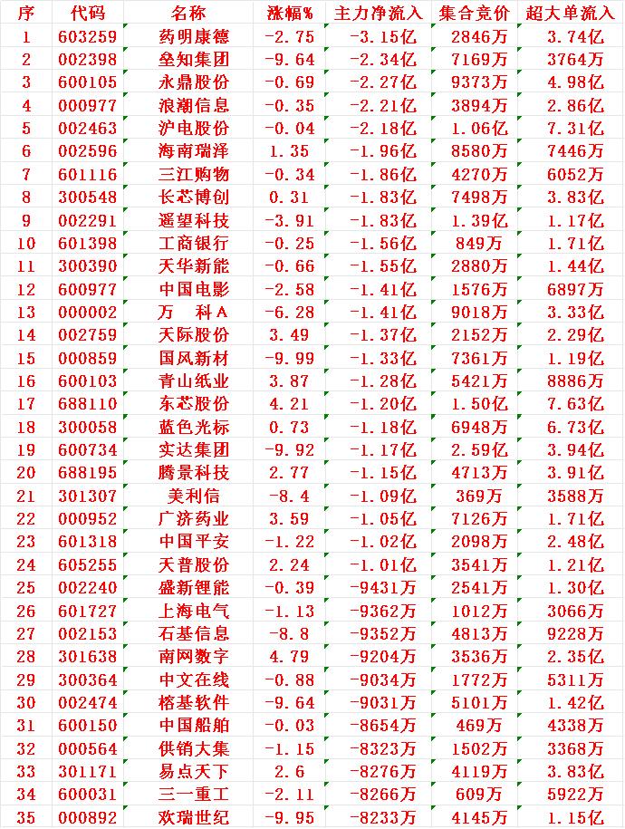 11月27日开盘45分钟,主力资金“卖出的 ”35名单! 药明康德:净流入 -3.15亿元 垒知集团:净流入 -2.34亿元 永鼎股份:净流入 -2.27亿元 浪潮信息:净流入 -2.21亿元 沪电股份:净流入 -2.18亿元