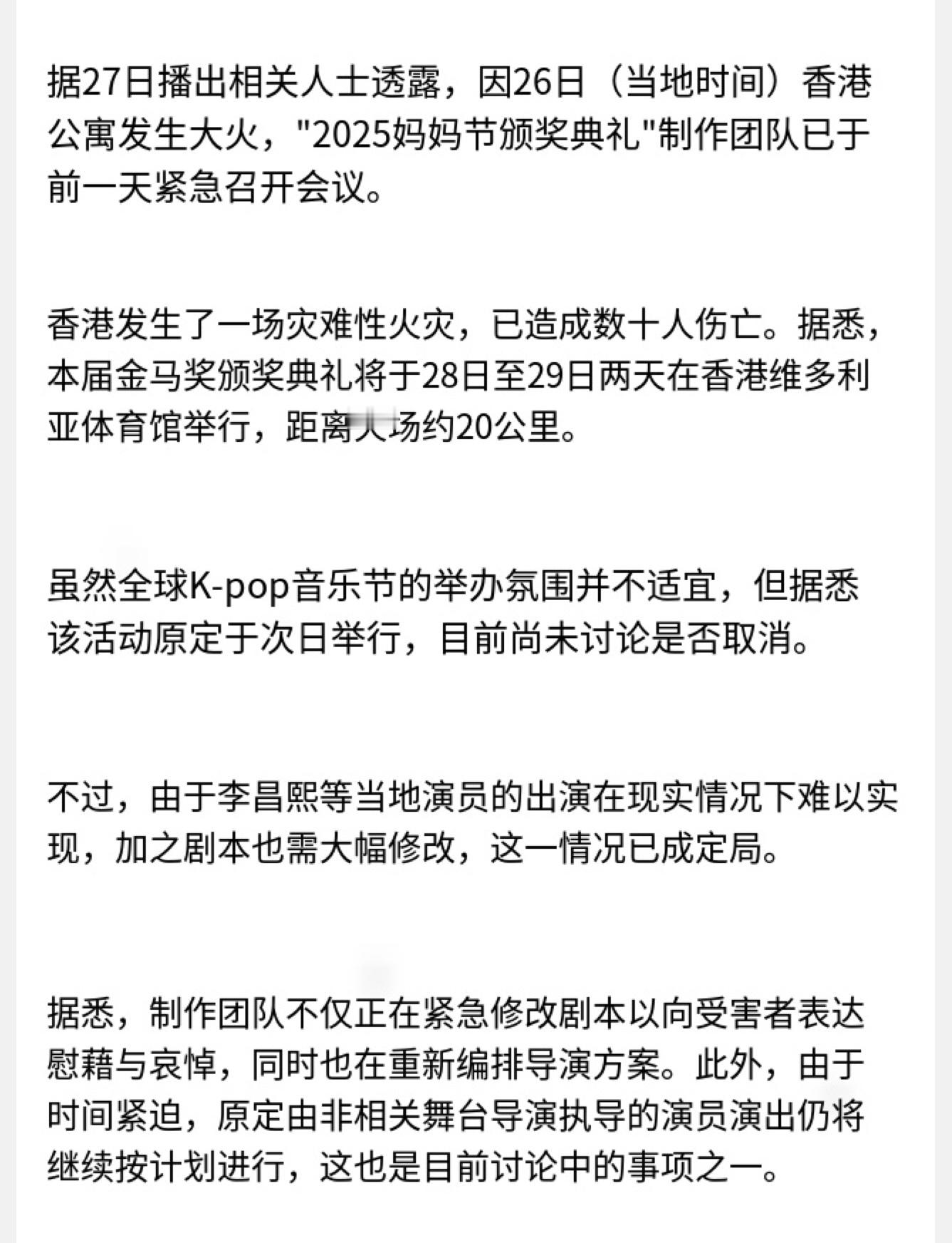 因为香港火灾,MAMA制作团队召开紧急会议,原定27-28日举行的典礼并未讨论是否取消。目前制作组正在紧急修改剧本,重新编排导演方案。更新:原本确定出席的周润发和杨紫琼确定不参加。香港MAMA盛典或将如期举行