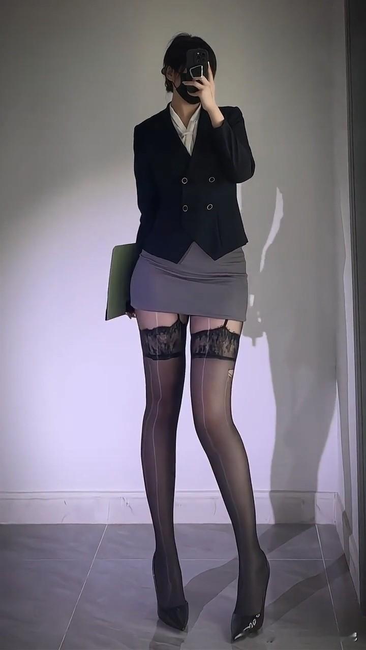 像这套:黑色双排扣西装保留干练感,内搭白衬衫打底,换条浅灰包臀裙,再用蕾丝黑丝和尖头高跟把精致感拉满,手里夹个文件夹,既有职场人的利落,又藏着不经意的柔媚,把“专业”和“女人味”融合得刚好,通勤时气场和风情都不落下。