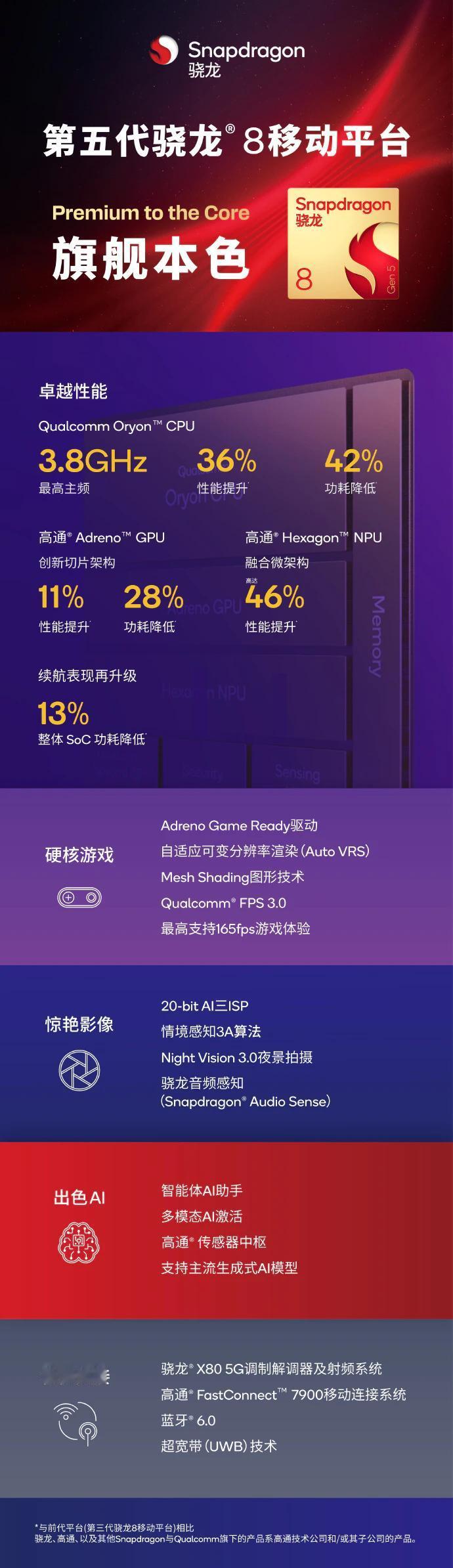 高通发布第五代骁龙 8 移动平台 11 月 26 日,高通公司正式推出第五代骁龙 8 移动平台,定位旗舰级 SoC,重点强化 CPU、GPU、NPU、影像与 AI 体验等核心性能。该平台搭载 Qualcomm Oryon CPU,最高主频 3.8GHz,相比上一代实现 36% 的性能提升与 42% 的功耗降低。整体 SoC 的续航表现亦同步优化,整体功耗降低 13%。 GPU 方面,采用全新架构的 Adreno GPU,带来 11% 性能提升 与 28% 功耗下降,并支持 Adreno Game Ready 驱动、自适应可变分辨率渲染(Auto VRS)、Mesh Shading 图形技术,以及 Qualcomm FPS 3.0,可实现最高 165fps 的移动游戏体验。NPU 则基于高通最新的 Hexagon 设计,AI 运算性能提升 46%。 影像系统使用 20-bit AI 三 ISP,支持情境感知 3A 算法、Night Vision 3.0 夜景拍摄,并搭载 Snapdragon Audio Sense 音频感知技术,实现更全面的影像与音频处理能力。 在 AI 与连接能力方面,第五代骁龙 8 平台配备智能体 AI 助手、多模态 AI 激活能力与传感器中枢,并可运行主流生成式 AI 模型。连接部分整合 骁龙 X80 5G 调制解调器与射频系统、FastConnect 7900 移动连接系统、蓝牙 6.0 以及超宽带(UWB)技术,实现更稳定与更高速的无线体验。