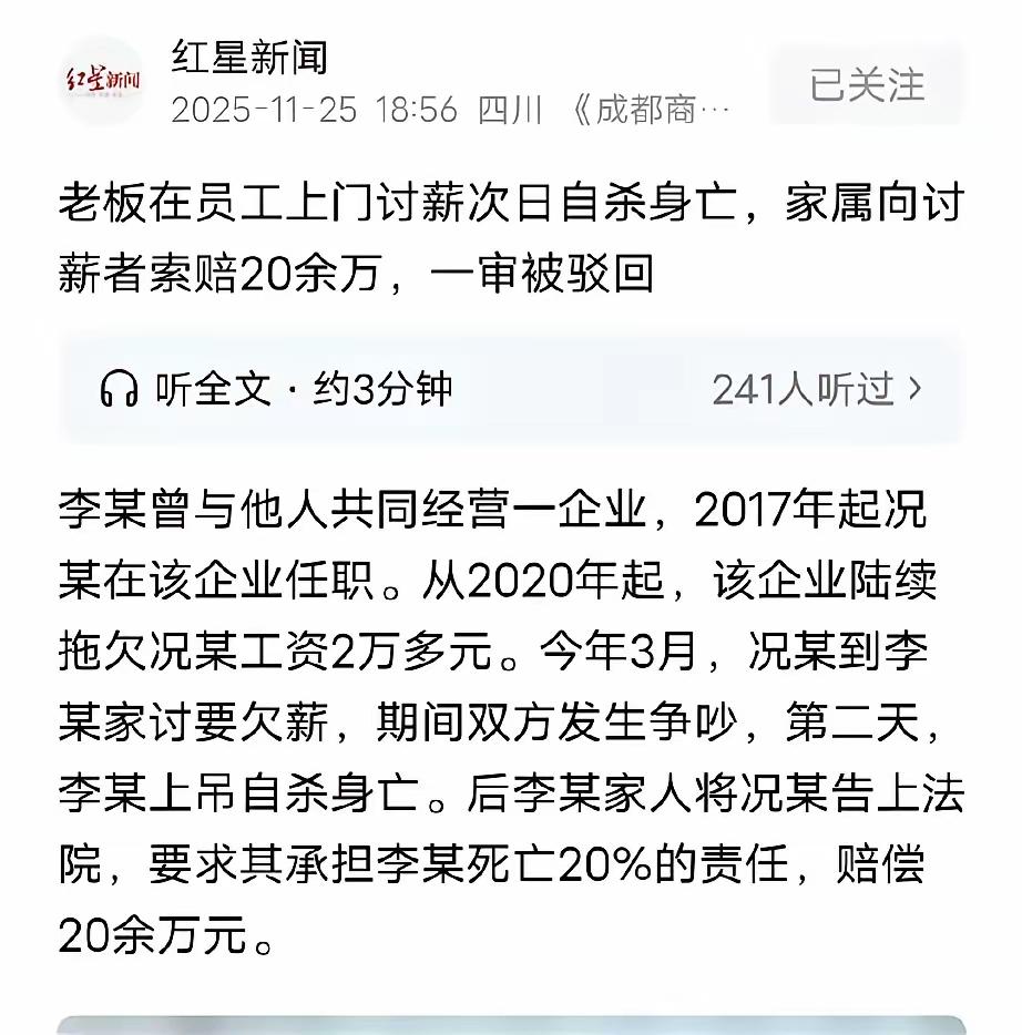 【案件分析】 一、案件事实 僱主李某与员工况某存在劳动债务关系,从2017年开始工作,一直未获得应得工资,总计欠款约2万元。 2025年3月2日,况某登门讨薪,与李某发生争吵,未成功拿回工资。 次日,李某在家中自杀身亡,家属因此诉讼,认为况某上门讨薪导致李某精神受到刺激,责令赔偿。 二、法院审理与判决 【行为是否侵权】况某的讨薪行为是维护合法权益的正当行为,现场也有民警劝和,未存在过激侵权行为。 【李某的死因】李某是成年人的自主行为,患有脑梗及抑郁症,存在自杀倾向,但其上吊自杀是自主决定,与况某的讨薪行为没有直接因果关系。 【责任归属】依据《民法典》第1174条,损害须由受害人故意造成,况某没有故意促使李某自杀,且其行为没有法律上的因果关系。 【证据支持】提交的录音、病历等证明李某有自杀倾向,且在之前已有自杀意念。 【法律适用】李某的死亡由其个人自主行为引起,与况某的合法讨薪无关,无须其承担责任。 三、法律结论 法院认为,况某的讨薪行为符合法律规定,没有侵权行为;李某的死亡是其自主选择,与况某没有因果关系。 因此,驳回李某家属的索赔请求。 四、法律依据 《民法典》第1174条:损害由故意造成的行为人不承担责任,除非行为人有过错或故意。 《劳动法》第50条:工资不得无故拖欠,债权人在合法范围内可以优先受偿。 五、总结 本案强调: 朴实依法维护劳动者权益的正当行为不应被指责; 自杀行为是个人自主决定,不应简单归咎于他人; 法律强调责任因果关系,除非有直接侵权行为,否则难以追究无关责任。 【建议】 勤奋维权,依法追讨工资; 关注心理健康,及时干预和帮助有抑郁倾向的个体; 企业应依法及时支付劳动报酬,防止类似悲剧发生。 愿每一位劳动者的权益都得到尊重,每一个生命都受到呵护。企业拖欠工资 公司欠薪