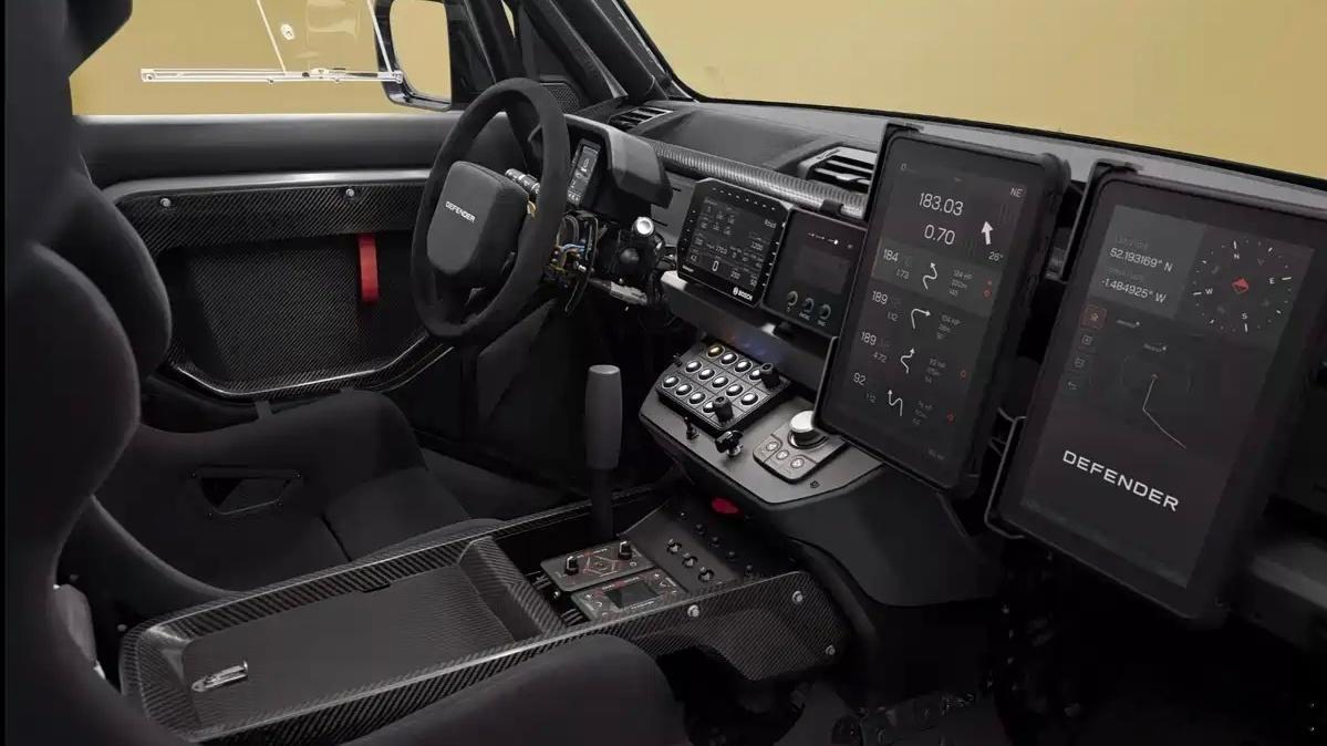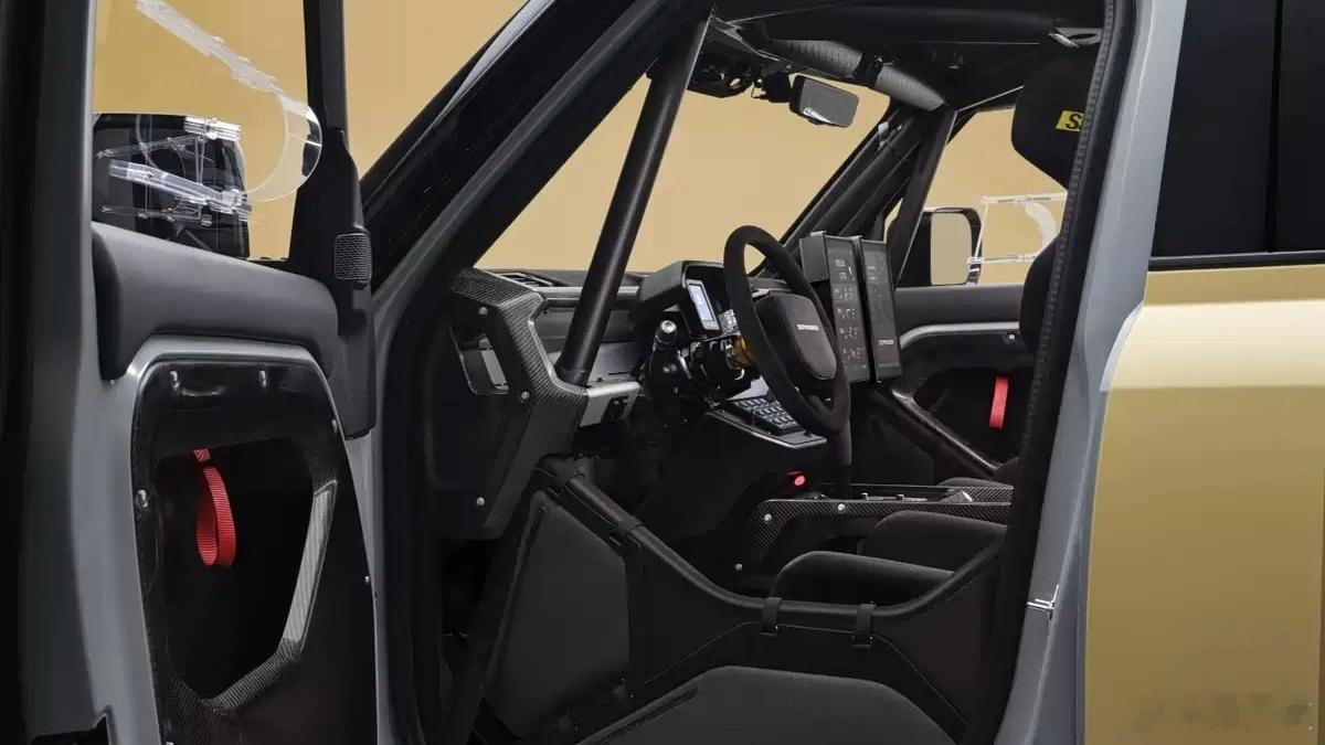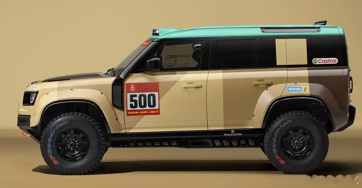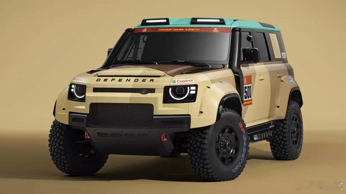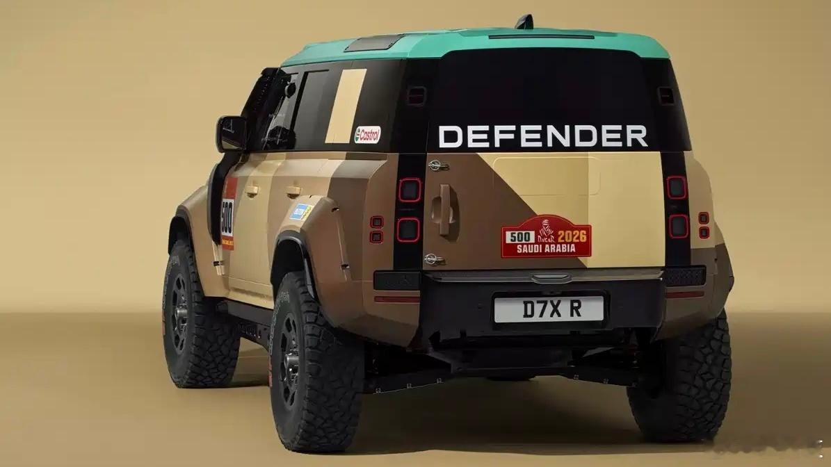 史上最强悍卫士来了!路虎卫士达喀尔D7X-R官图,由量产车型改装日前,路虎发布卫士达喀尔D7X-R官图,这可能是迄今为止最强悍的卫士车型,原因是它专为2026年世界拉力越野锦标赛和达喀尔拉力赛打造,尽管车辆经过升级,但新车型仍然将参加量产组的比赛。新车将在2026年1月沙特阿拉伯拉力赛首秀,并与卫士OCTA一起生产。卫士达喀尔D7X-R并没有像想象中那样增加复杂的装备,在越野与轻量化中间找到了折中方案,目的是超越沙丘时,这台车可以能更轻松地跳跃。因此除了漂亮的涂装以外,整车并没有看上去很夸张。当然一些基础的改装仍然是有的,比如加大的前格栅、外扩的轮眉、A柱两侧的双尾喉、车顶的射灯,还有专属的35英寸越野胎、高性能Bilstein减震器、前六活塞和后四活塞制动卡钳。为了轻量化,这台车还砍掉了车尾的备胎。车内增加了防滚架,换装轻量化饰件,增加六点式赛车座椅,以及额外的显示屏,后排座椅也被移除,改为放置三个全尺寸备胎、工具包、千斤顶等装备。动力上,新车搭载4.4T双涡轮增压V8发动机,匹配8AT变速箱,这些都在量产车型上出现过,但调整了传动比,以适应越野比赛。新车还引入赛车控制单元,可调整扭矩输出,使车辆在沙丘间跳跃后能平稳着陆,同时,新车还采用了全新的超大油箱,适应远距离赛段。大家一起来感受下!路虎卫士
