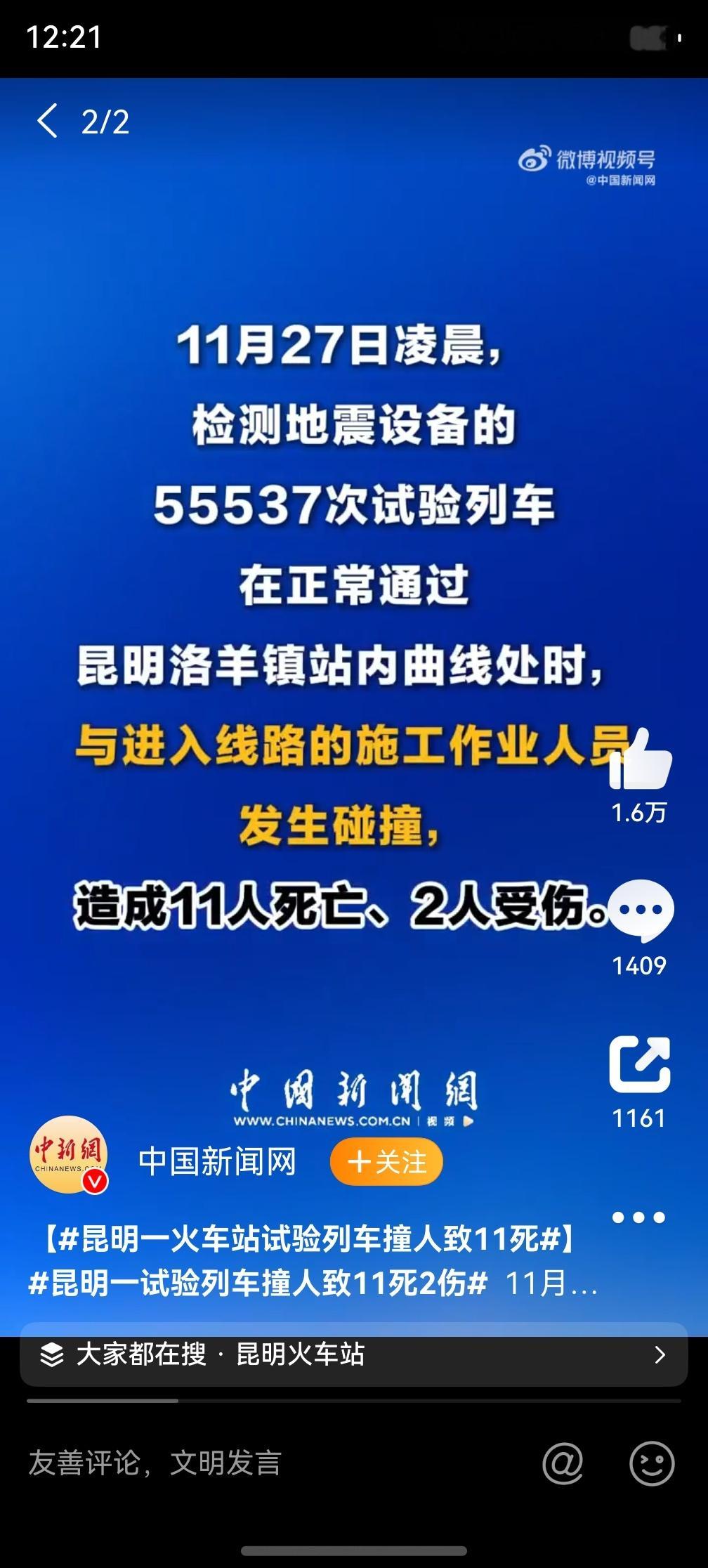 昆明一火车站试验列车撞人致11死 我的天,11个