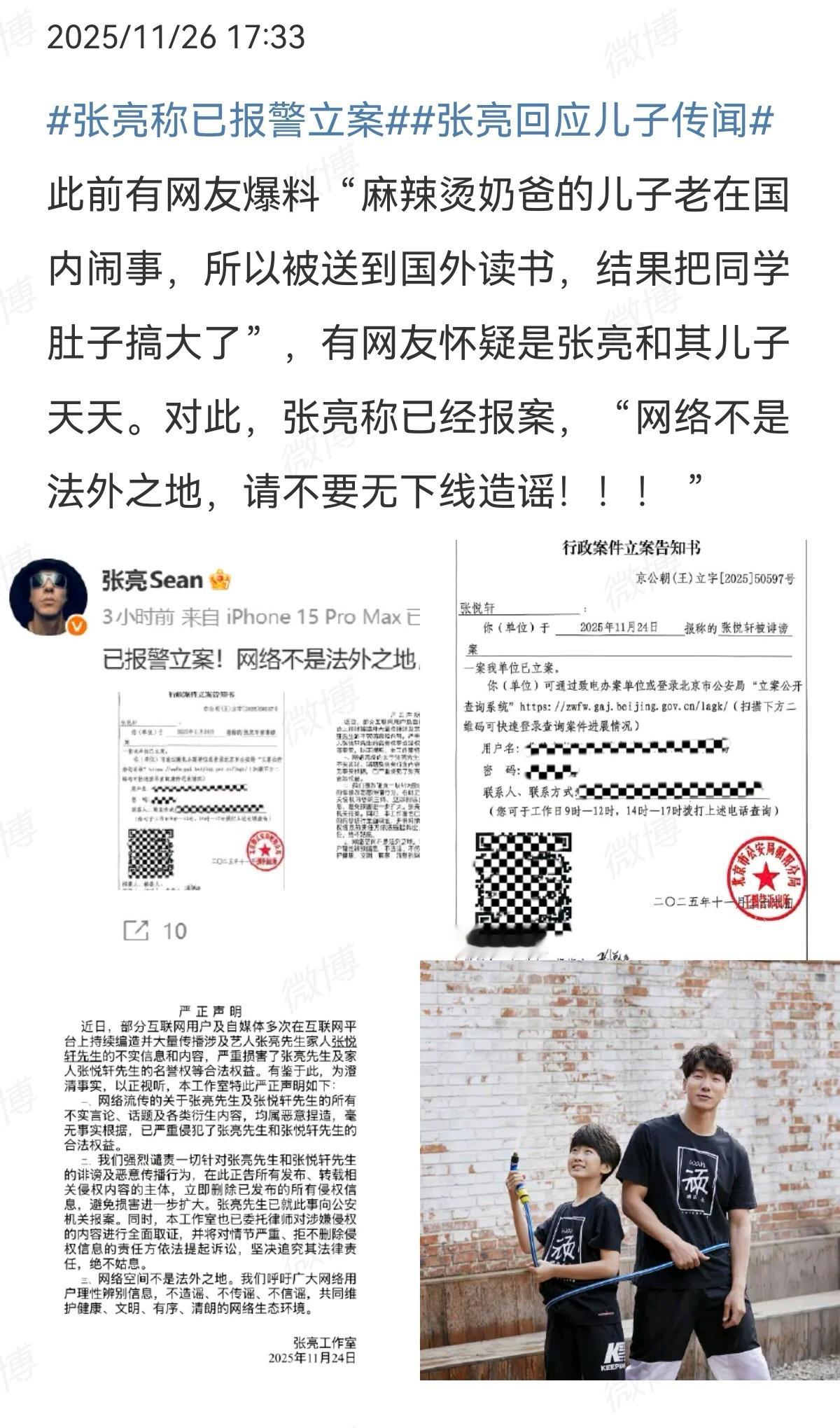 张亮报案张亮报案并发了严正声明。因为有人造谣他未成年儿子张振轩。