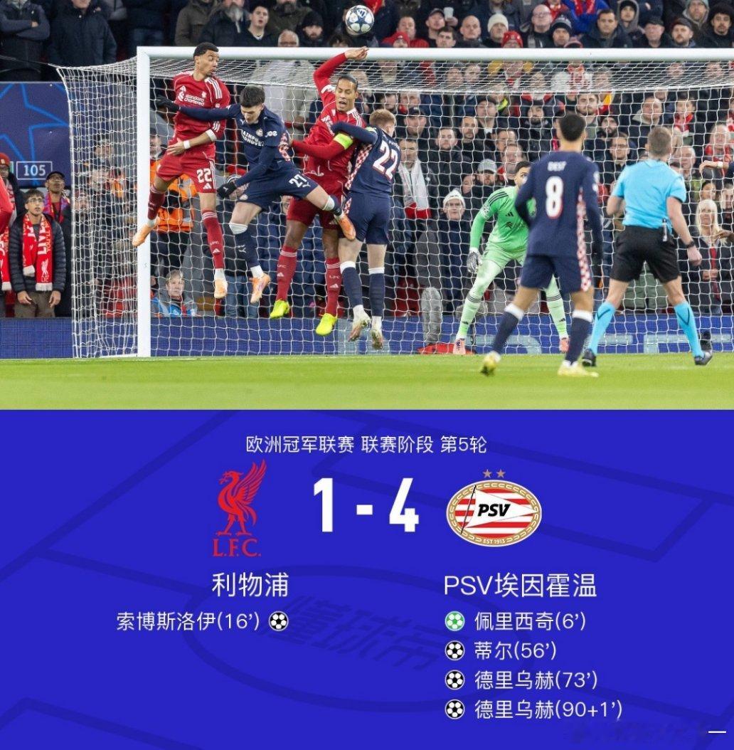 利物浦1比4埃因霍温三连败!利物浦1-4埃因霍温,范戴克送点,德里乌赫双响北京时间11月27日4:00,欧冠联赛阶段第5轮,利物浦坐镇安菲尔德球场迎战埃因霍温,本场主裁判为亚历杭德罗-埃尔南德斯。上半场,范戴克手球送点,佩里西奇点射闪击,索博斯洛伊补射扳平比分。下半场,利物浦后防形同虚设,蒂尔破门,德里乌赫替补登场梅开二度。最终,利物浦主场1-4惨败埃因霍温,遭遇各项赛事三连败。利物浦vs埃因霍温欧冠