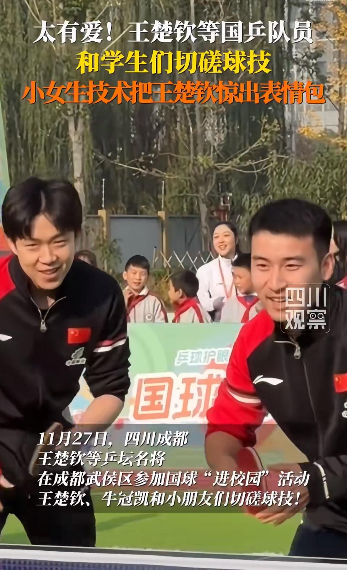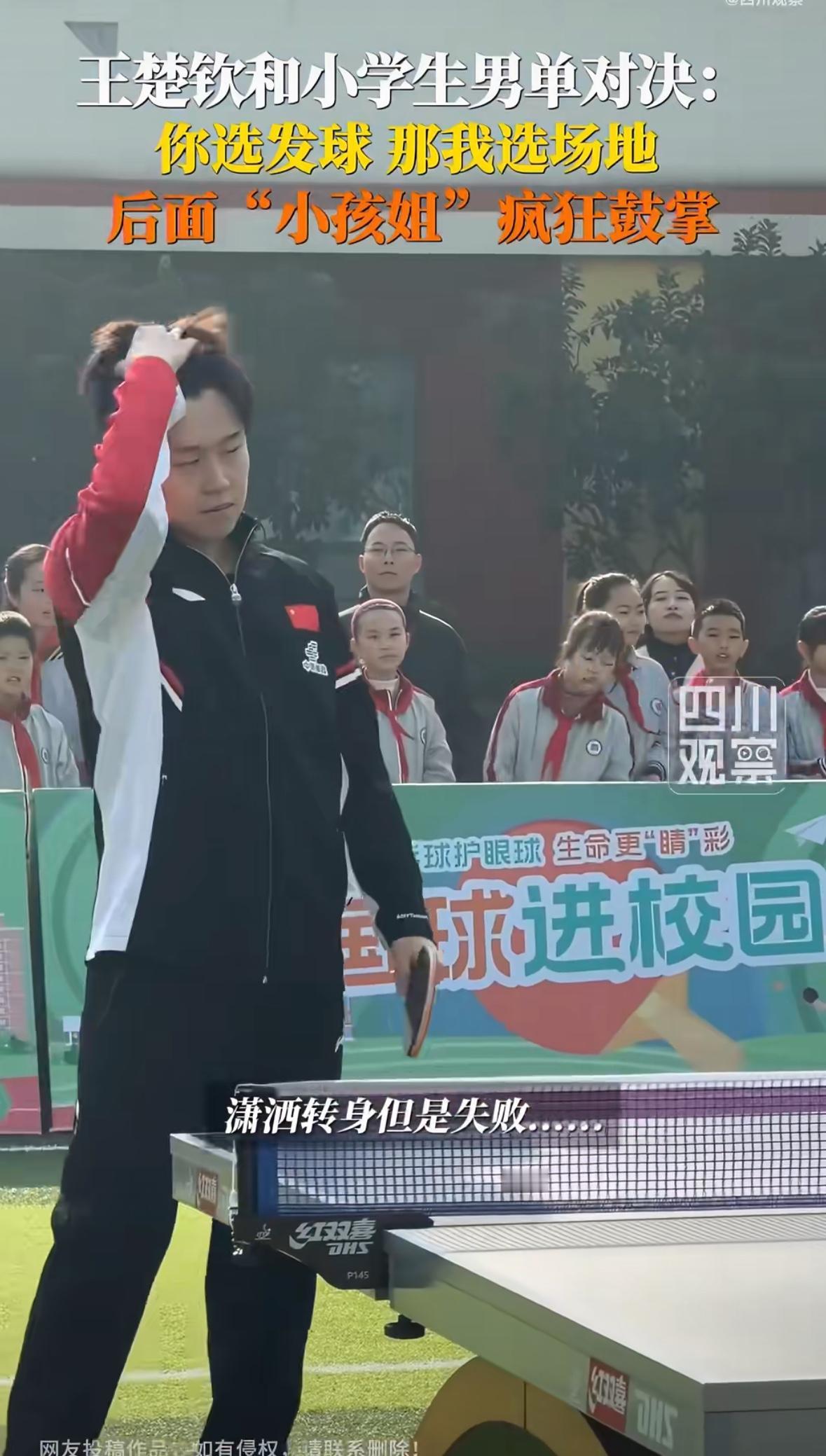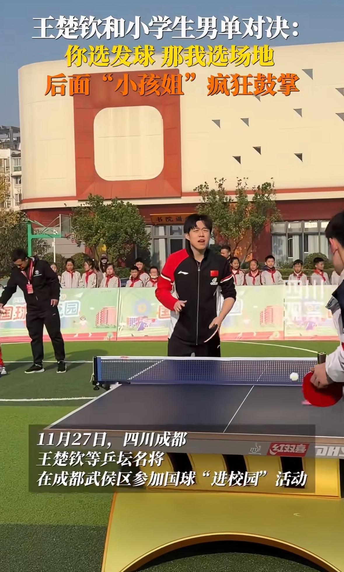 11月27日 和王楚钦打球的同学吐槽王楚钦:他让我去晃眼那边打球 还把我的签字笔带走了! 国乒进校园活动结束后, 和王楚钦打球的同学吐槽王楚钦: “王楚钦哥哥让我先发球, 但是他选择了另一边, 不晃眼睛的那一边, 让我选择晃眼那一边打球, 我找他签名的时候, 他忘了还我笔, 把我的记号笔拿走了, 昨天晚上我非常激动, 有点睡不着, 早上上课,那20分钟我 都没听进去!” 小同学真可爱, 真诚实, 王楚钦的眼睛晒不了一点太阳, 你选择发球,我选择场地, 公平公正嘛, 没毛病啊! 至于笔让王楚钦拿走了, 回头你找他要回来吧, 这都不是事!