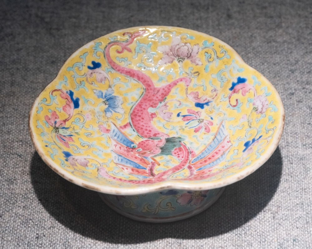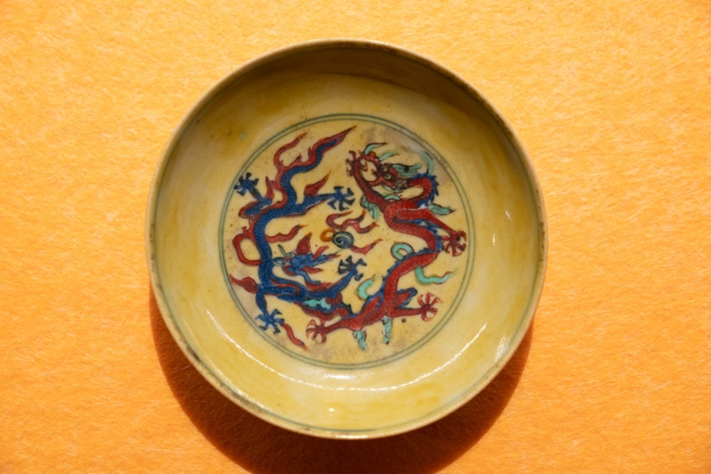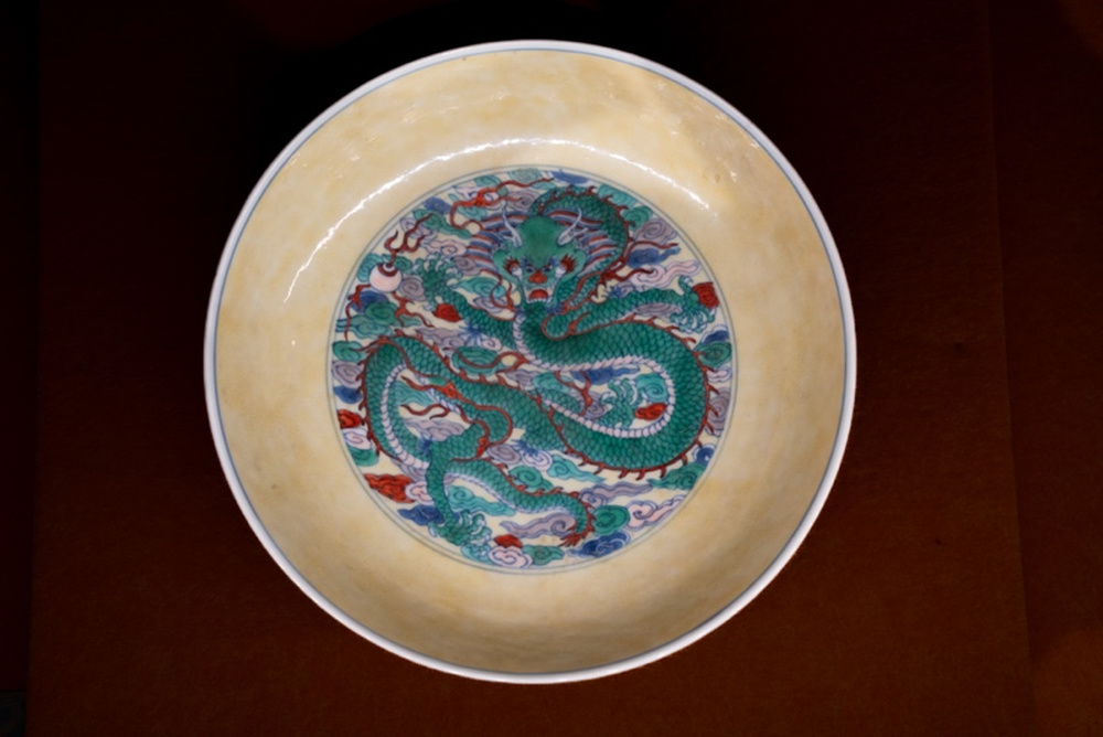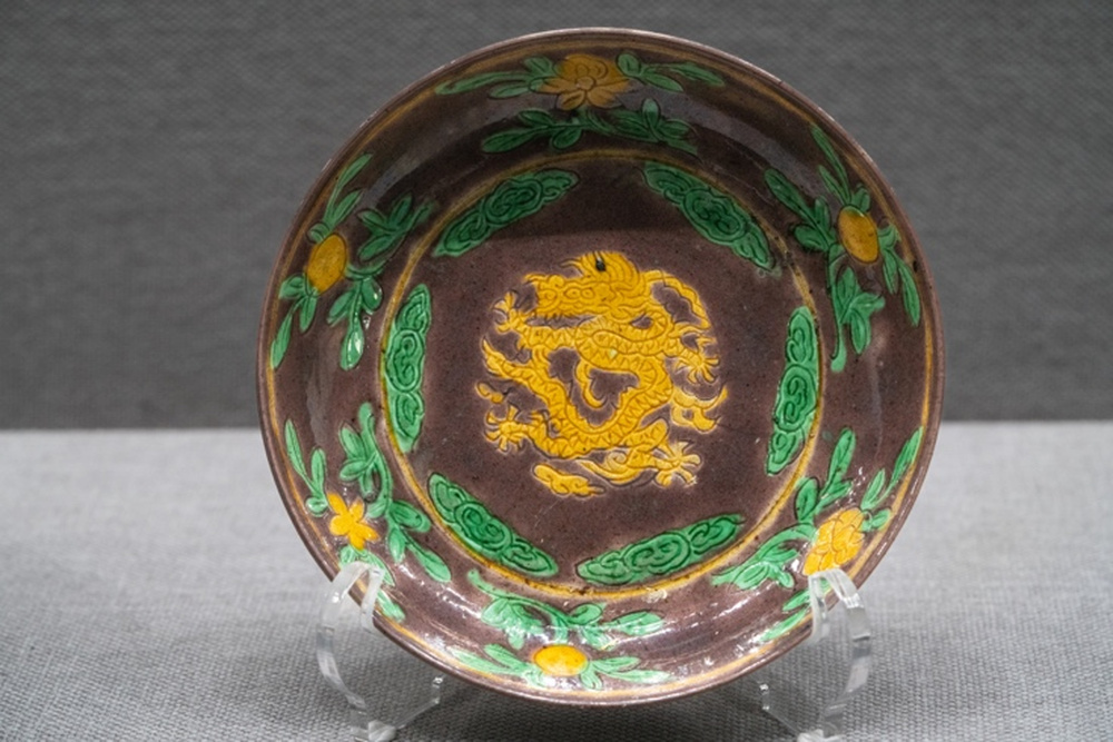 紫地素三彩锥拱折纸花果云龙纹盘明