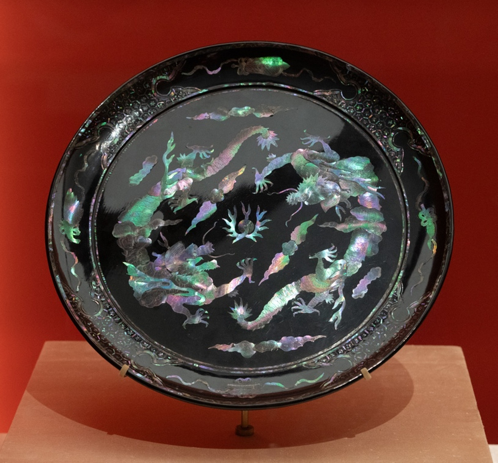 嵌螺钿是漆器的重要品类,所谓螺钿,是将螺壳、夜光贝分层剥离,磨制成图形、文字等薄片,根据需要镶嵌在器物表面,应用于漆器、家具、乐器等工艺品上。黑漆古朴静谧,映衬着螺钿花纹色彩千变万化,光彩夺目。