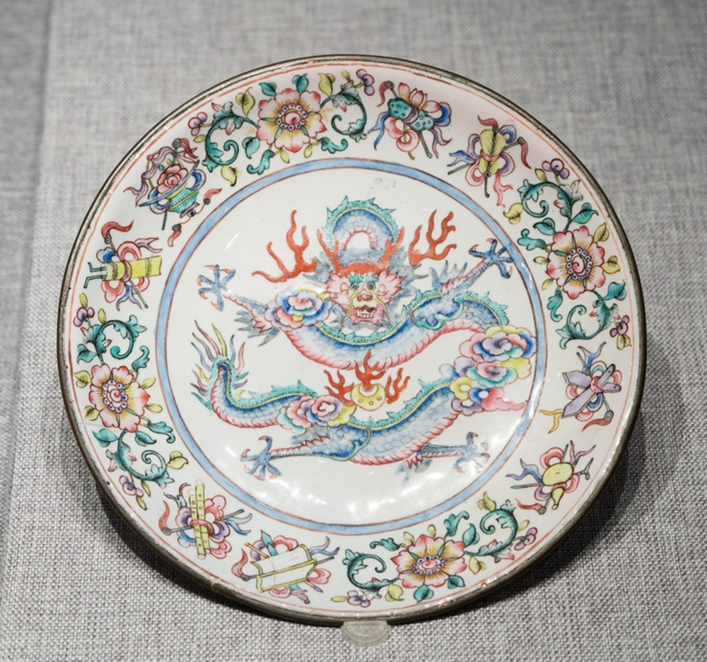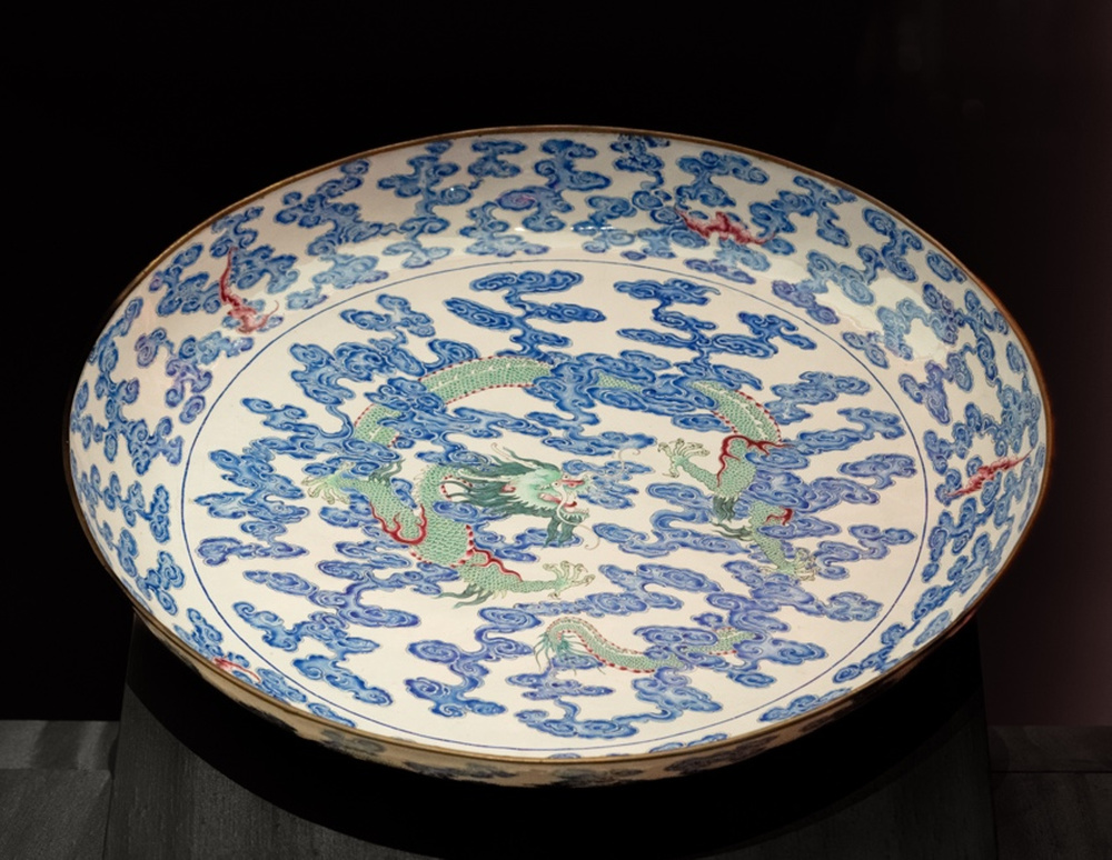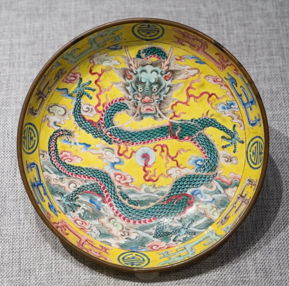 龙纹盘釉色丰富,纹样清晰,各个时期的龙纹盘有其不同的风貌和特点。龙纹在瓷器上的出现不晚于南北朝,唐代已较常见。宋代是龙纹瓷器的重要发展期阶段,官、哥、汝、定、钧五大名窑烧造的龙纹盘各有不同,釉色上大都清新雅致,给人以自然朴素、大气端庄之感。元代龙纹以青花为主,成功创烧釉里红,并发展了孔雀绿釉等品种。明代以青花为主,创烧斗彩(创烧于明宣德年间,成熟于成化时期)、五彩、素三彩等。清代在彩瓷工艺上取得重大突破,康熙晚期创烧珐琅彩,同时粉彩萌芽;雍正时期粉彩成熟,乾隆时期彩瓷工艺集大成,龙纹盘色彩更为绚丽多样。不同颜色的龙纹盘配色,展现出不同的风貌。