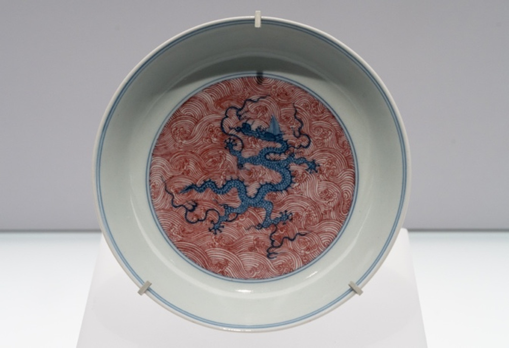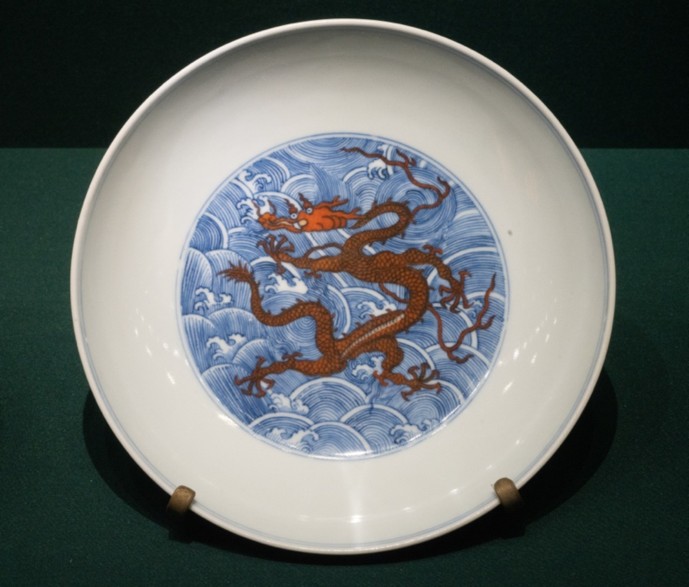 蓝、红与白的结合是青花釉里红装饰的典型配色。