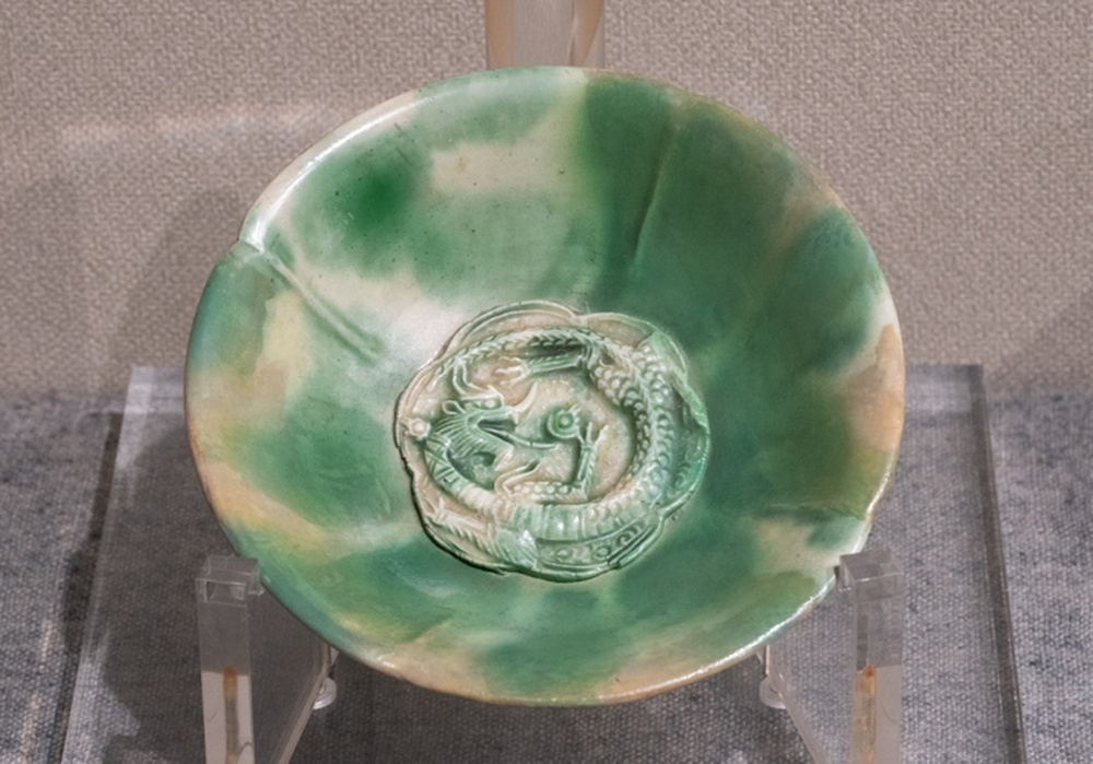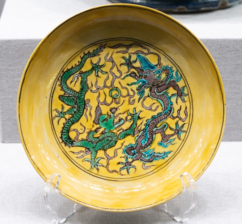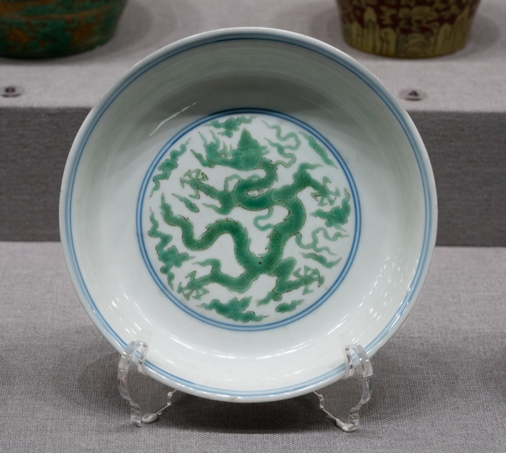 绿釉与黄釉搭配成的黄地绿彩瓷器是宫廷常见器物。绿色釉彩纯正自然,黄色底釉匀净明亮,组合装饰效果极佳。