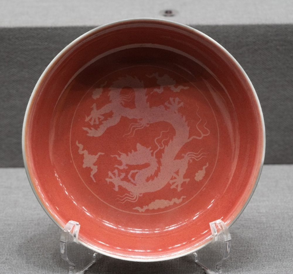 红釉创烧可追溯至元代,明永乐时期,景德镇成功烧制出釉色纯正的鲜红釉(铜红釉),技艺达历史高峰,有“永器鲜红最贵”之说。红釉瓷器釉色鲜红明艳,宝光耀目。