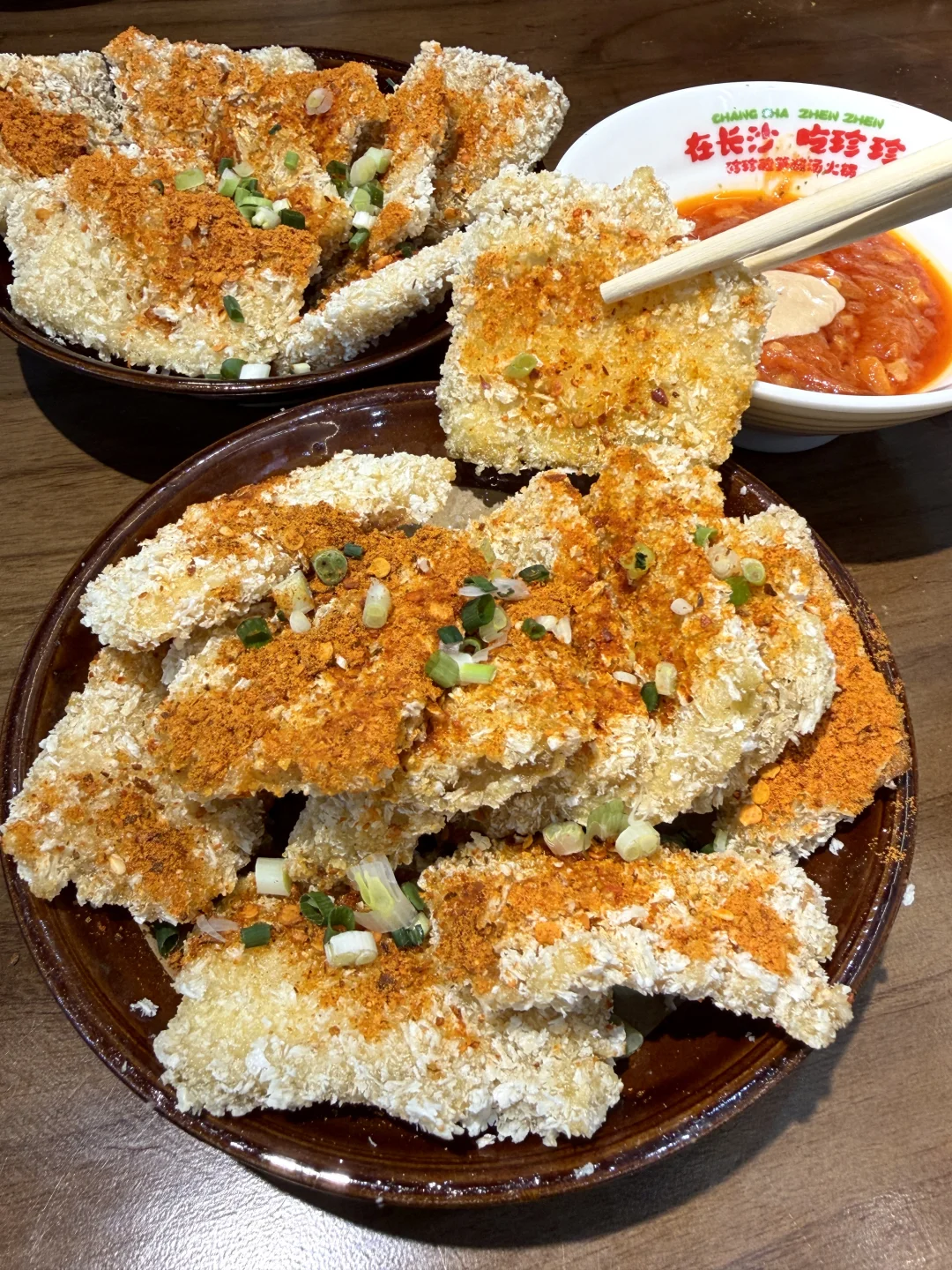 咸蛋黄鸡翅、炸茄片、辣子鸡…人均40r左右! 跟着长沙大学生去吃的!出地铁口直奔!! 就在大学城的: 珍珍 酸笋 酸汤火锅!