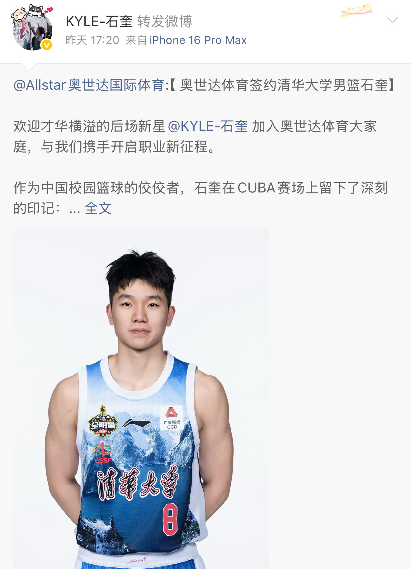 2026年CBA选秀状元热门石奎签约经纪公司 cba