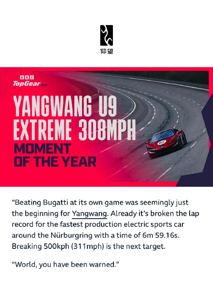英国权威汽车媒体《Top Gear》将仰望U9 Xtreme极速突破496.22km/h的成就,评为“年度时刻”,并评价“让燃油引擎车型黯然失色”。【来自懂车帝车友圈】