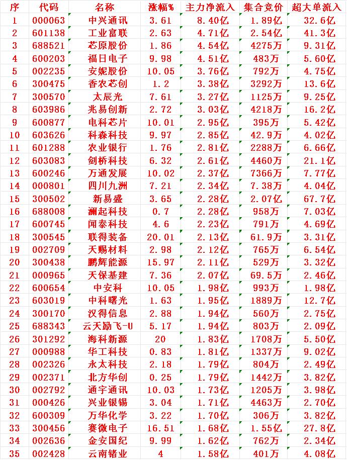11月27日尾盘30分钟,主力资金“大幅抢筹的”35名单一览! 中兴通讯:净流入 8.40亿元,集合竞价成交 1.89亿元 工业富联:净流入 4.71亿元,集合竞价成交 2.54亿元 芯原股份:净流入 4.54亿元,集合竞价成交 4275万元 福日电子:净流入 4.51亿元,集合竞价成交 483万元 安妮股份:净流入 3.76亿元,集合竞价成交 792万元
