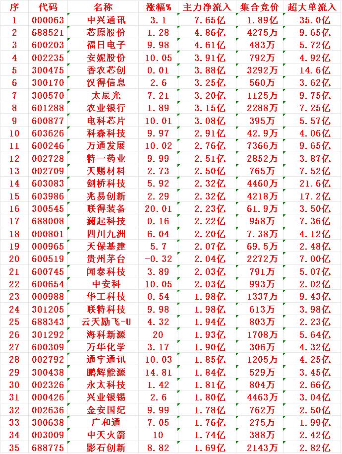 11月27日收盘,主力,已经大幅卖出的35名单: 中际旭创:净流入 -14.2亿元 沪电股份:净流入 -9.64亿元 宁德时代:净流入 -8.09亿元 蓝色光标:净流入 -7.28亿元 药明康德:净流入 -6.40亿元 浪潮信息:净流入 -5.98亿元 永鼎股份:净流入 -5.87亿元 长芯博创:净流入 -5.40亿元 特变电工:净流入 -5.01亿元 雷科防务:净流入 -4.88亿元 11月27日收盘,主力资金“大幅买入”的35名单: 中兴通讯:净流入 7.65亿元 芯原股份:净流入 4.86亿元 福日电子:净流入 4.61亿元 安妮股份:净流入 3.91亿元 香农芯创:净流入 3.88亿元 汉得信息:净流入 3.25亿元 太辰光:净流入 3.20亿元 农业银行:净流入 3.15亿元 电科芯片:净流入 3.08亿元 科森科技:净流入 2.91亿元 万通发展:净流入 2.76亿元 特一药业:净流入 2.51亿元 天赐材料:净流入 2.50亿元 剑桥科技:净流入 2.32亿元 兆易创新:净流入 2.32亿元