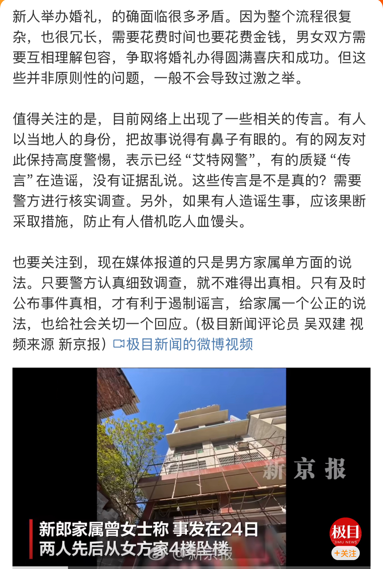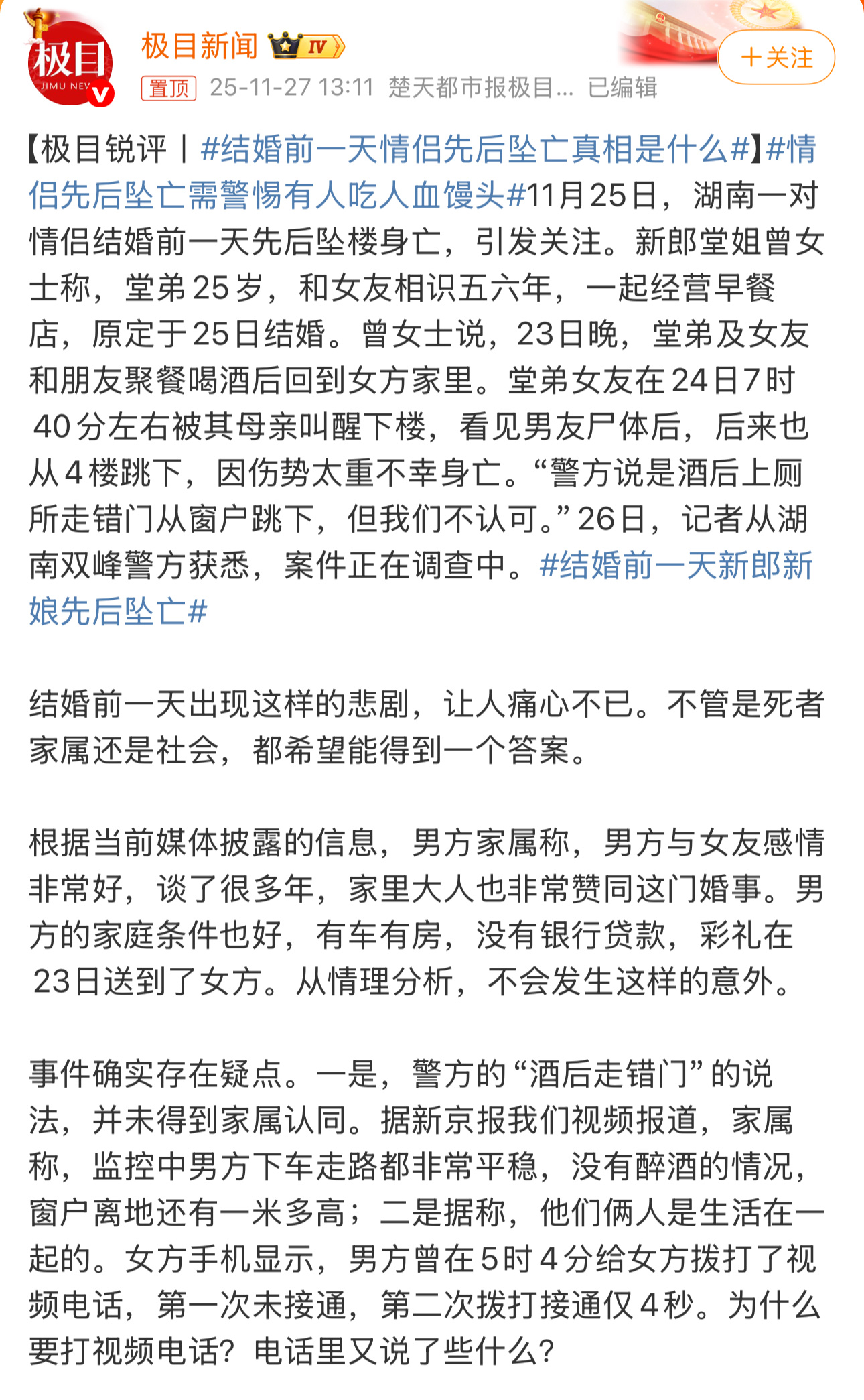 极目新闻就这个新闻→_→结婚前一天新郎新娘先后坠亡写了篇评论文章,做了个话题叫→_→情侣先后坠亡需警惕有人吃人血馒头整篇文章的内容,我个人认为,就是在吃人血馒头热点观点 结婚前一天新郎新娘先后坠亡