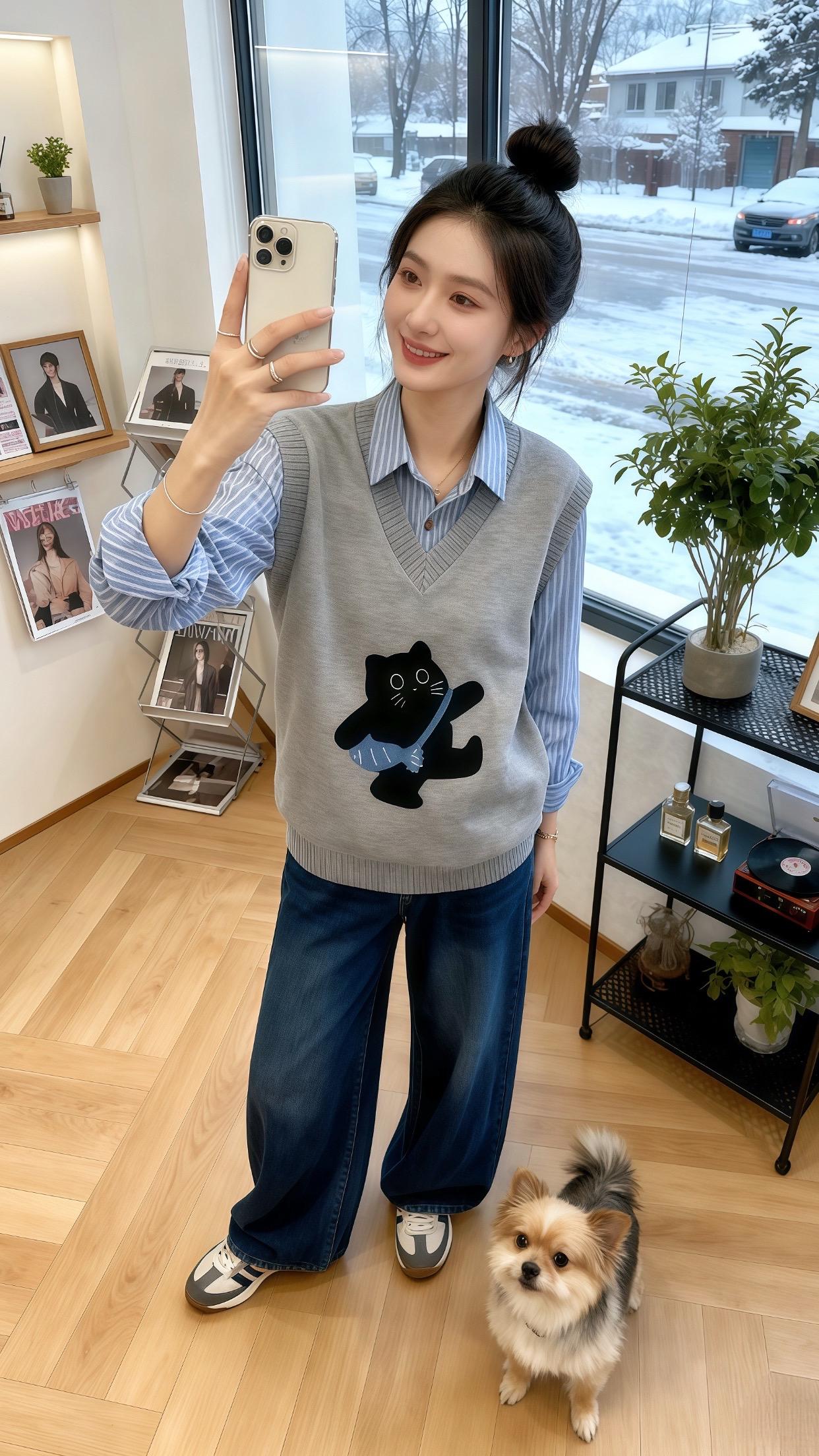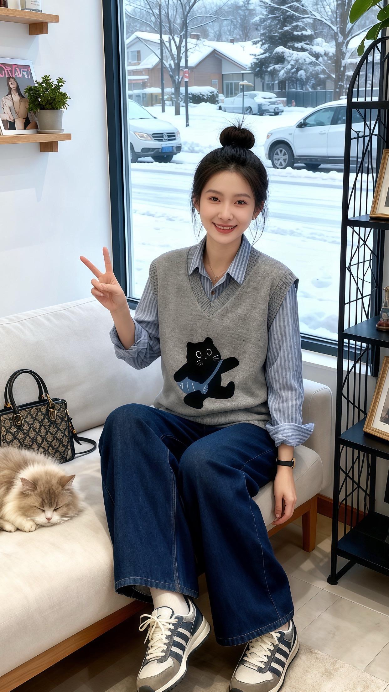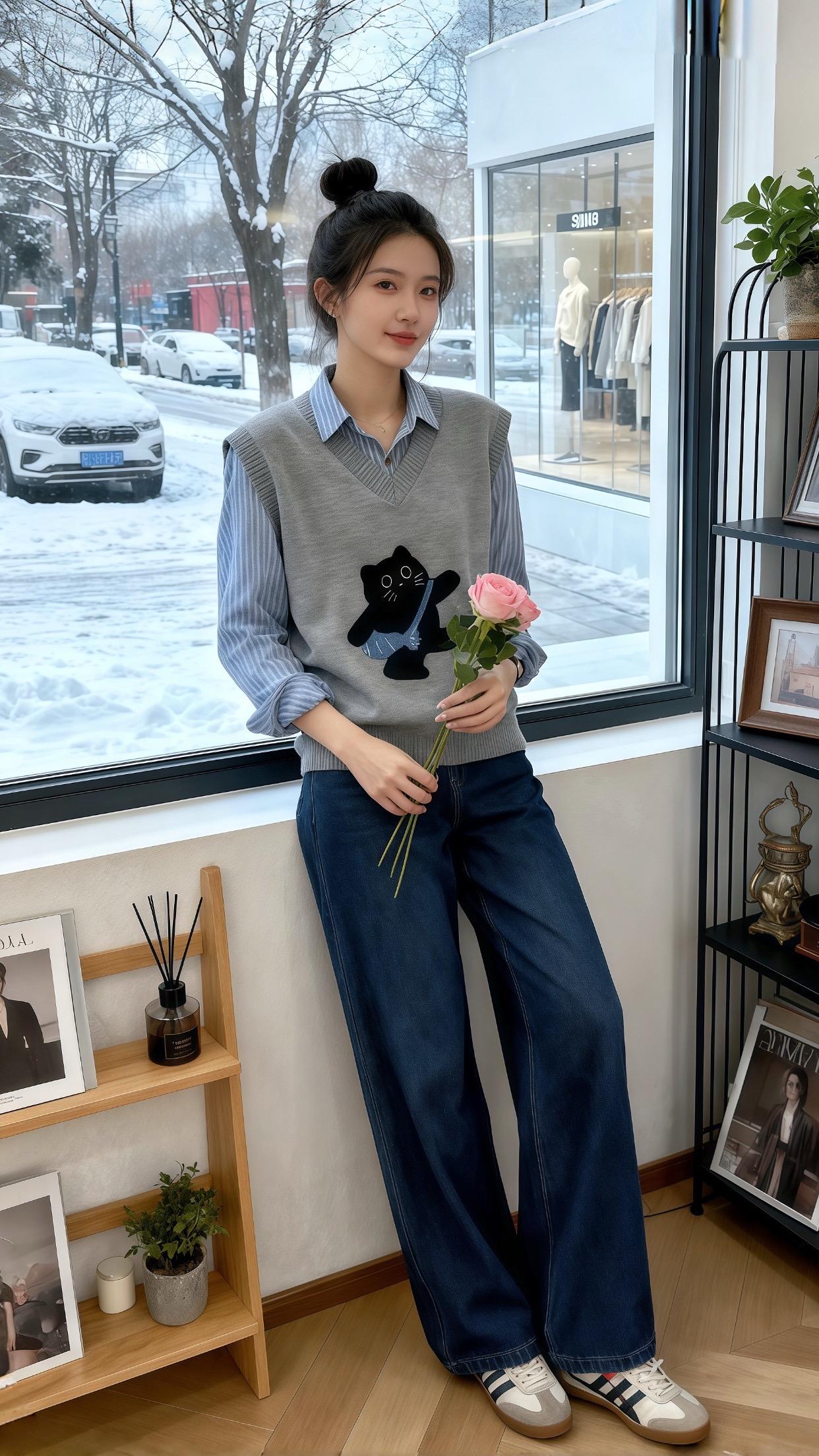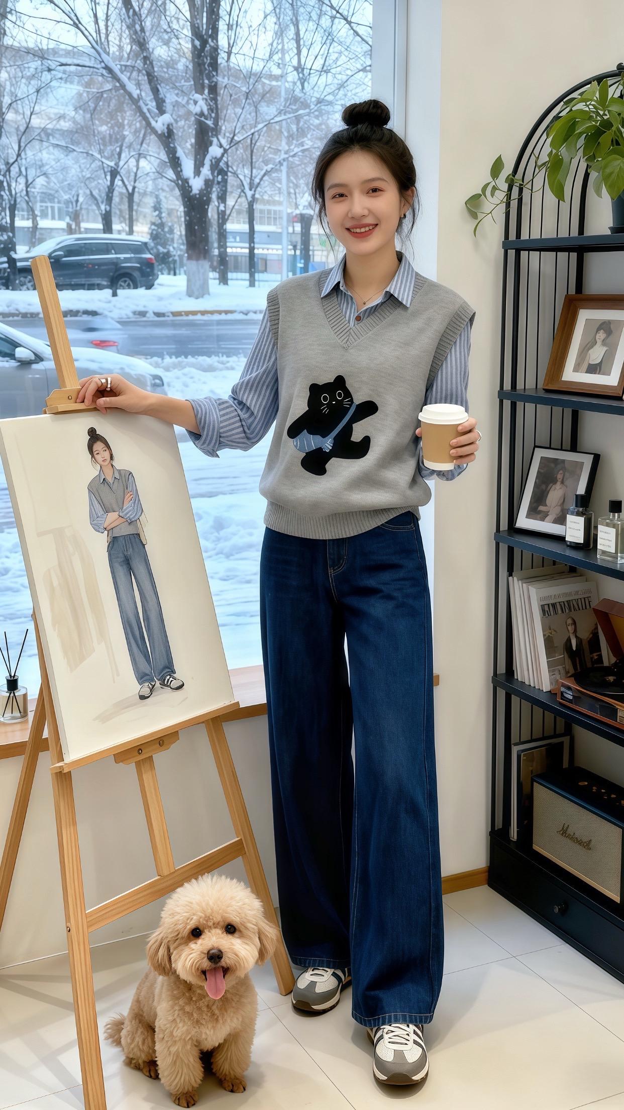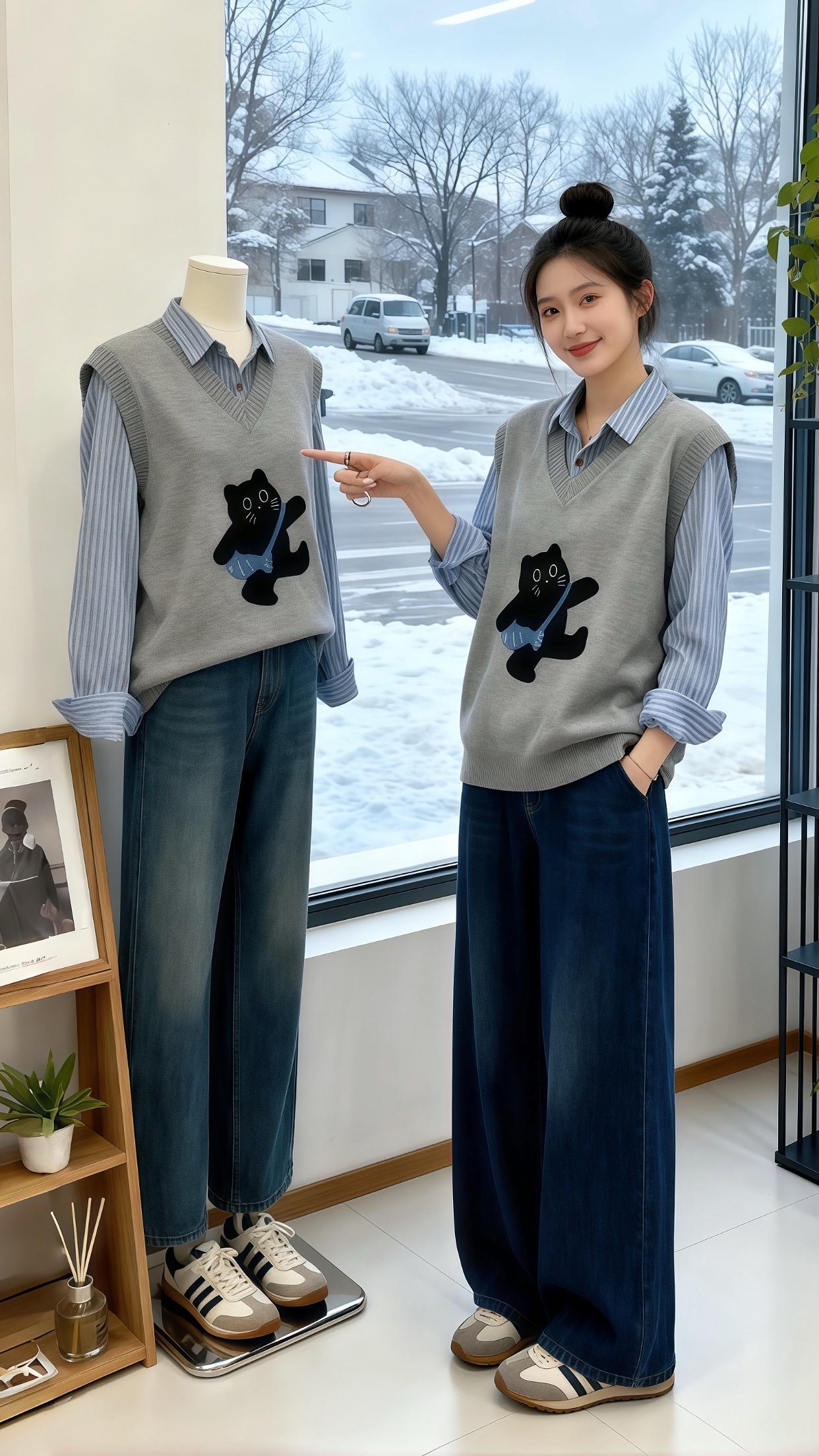 降温天裹上这件V领马甲,像被软乎乎的秋阳裹住—刺绣小猫歪着脑袋,像把“生活可爱”四个字缝在了身上。内搭条纹衬衫,配垂坠感阔腿裤,是通勤路上被风掠过也暖融融的松弛,也是咖啡店里被邻座悄悄问出处的小得意。明明是件基础款,偏生让日常多了点“今天值得好好打扮”的雀跃,连带着心情都跟着这件马甲,软和又舒展。