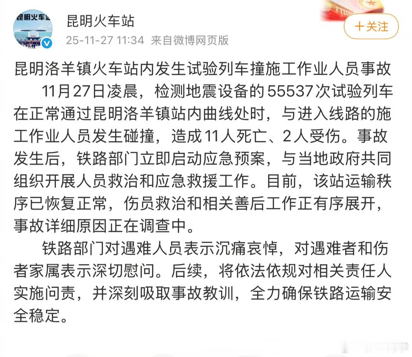 昆明一火车站试验列车撞人致11死凌晨试验列车正常通过时,与进入线路的施工作业人员发生碰撞,致11人死亡,2人受伤。