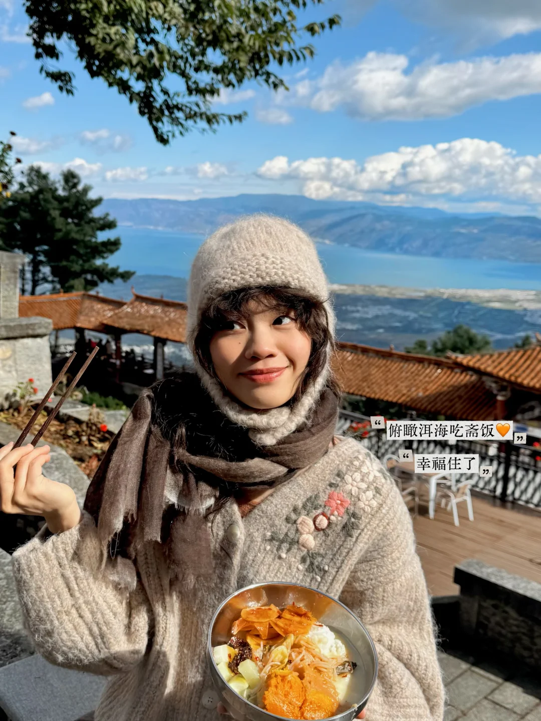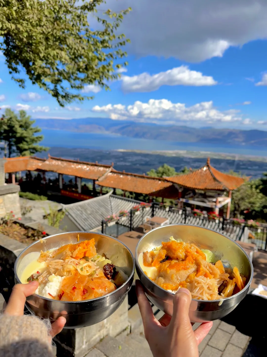 淡季游客不多,端着斋饭坐在寺门口一边俯瞰洱海一边清清静静吃饭🍚幸福哟!