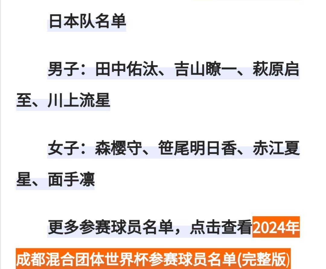 中国与日本、韩国、德国争夺混合团体“成都杯”! 2025年成都混合团体世界杯 前八种子队: 中国,日本,韩国,德国;中国台北,法国,埃及,印度。 前四大种子队: 中国两届冠军 韩国两届亚军 日本2023季军 德国2023第四 前四大种子队中日、韩、德,是国乒争夺“成都杯”的挑战者! 尤其注意日本队! 2024年日本“二队”参赛选手,均是名不见经传的。见图4。 2025年,确定混合团体赛首入洛杉矶奥运会,日乒尽遣主力参赛! 张本美和,伊藤美诚,大藤沙月,早田希娜;张本智和,户上隼辅,松岛辉空,篠塚大登。 国乒加油!