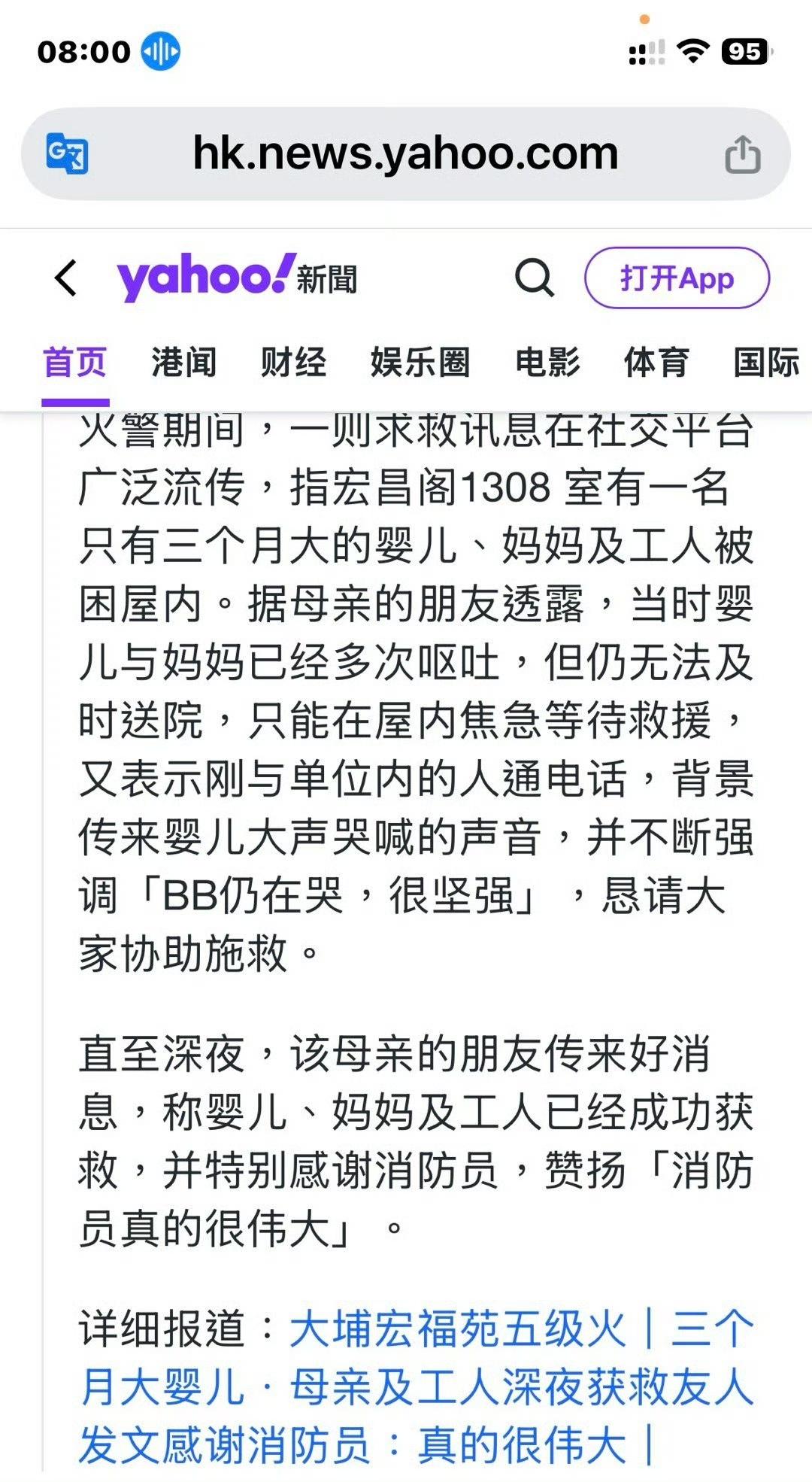 看到这张照片既心疼又欣慰,香港火灾中一名三个月大的宝宝在凌晨时分被成功获救,小家伙戴上了氧气面罩被送往医院。 大火之中,小宝宝和妈妈当时已经多次呕吐,被围困的她们只能等待消防员前来救援,好在后来宝宝妈妈与单位里的人成功通话,并等来了希望。 小宝宝真的很坚强,母女俩能被顺利救出真的太好了!