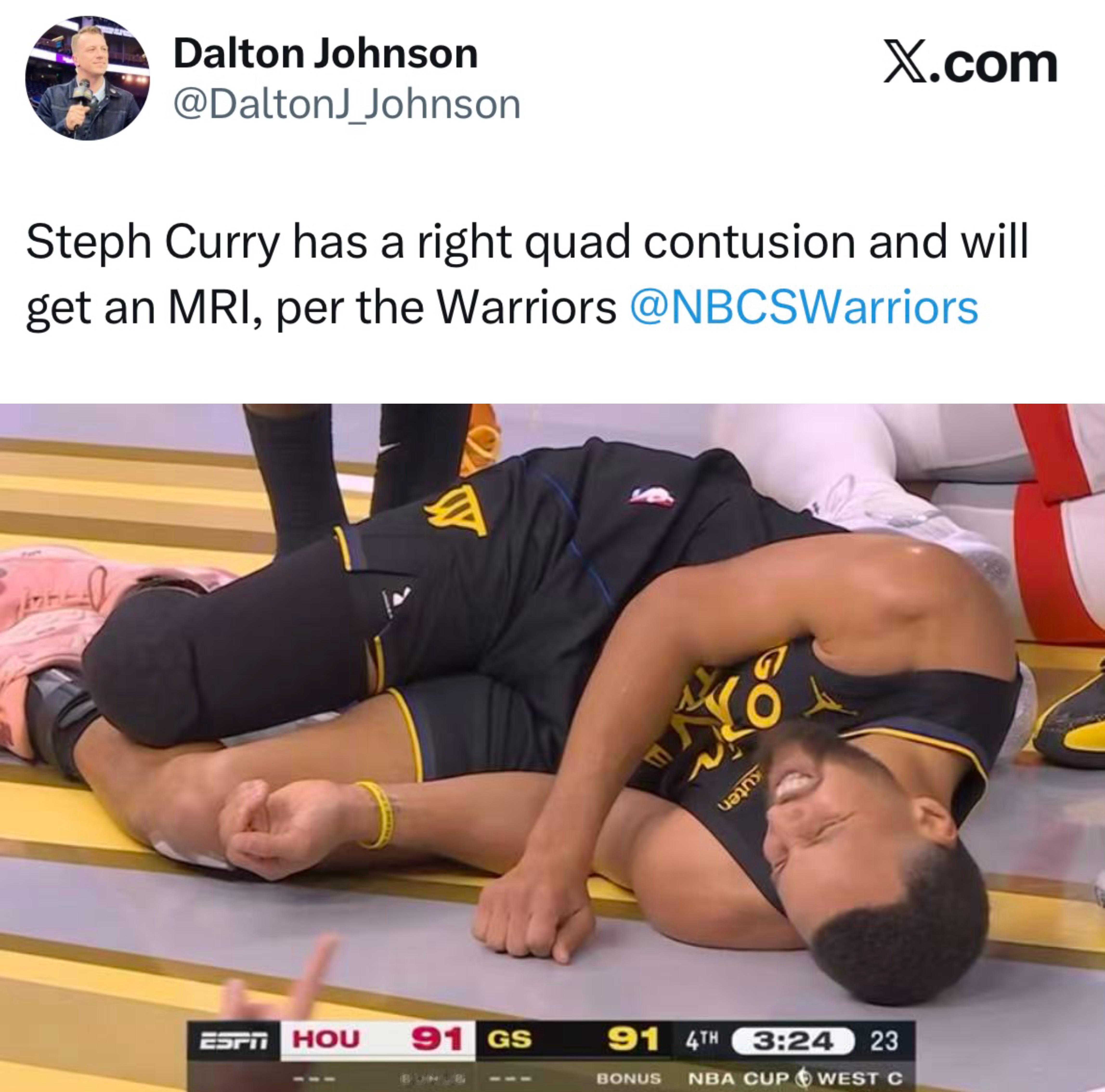 库里右腿股四头肌挫伤,将接受核磁共振检查。