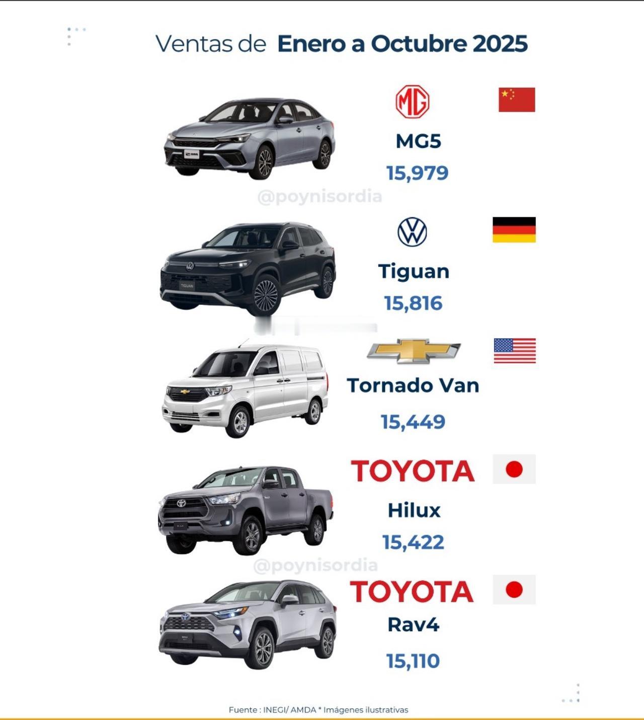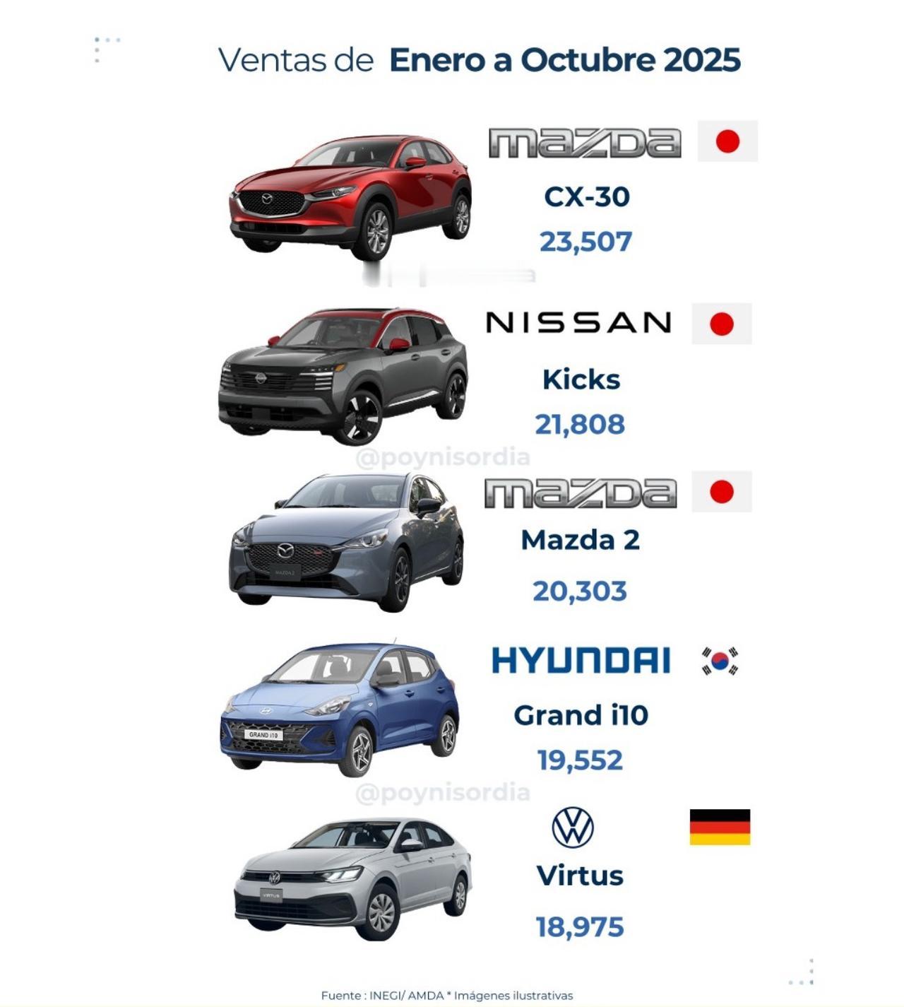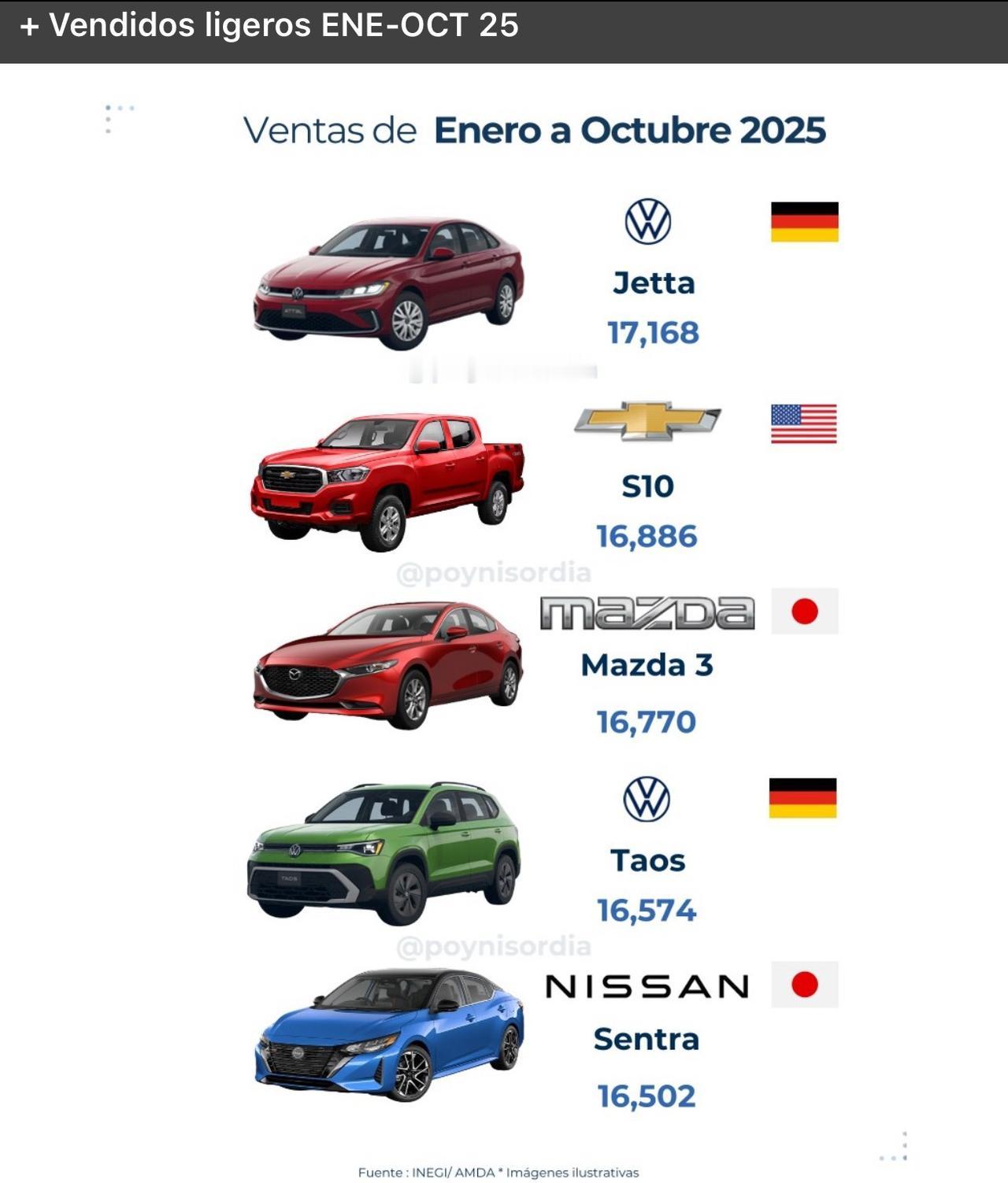 【2025年1-10月墨西哥轻型车销量】 日产Versa稳坐冠军宝座,卖出7.4万台。雪佛兰Aveo、起亚K3紧随其后,分列二三名。 日产表现强势,5款车型上榜,3款挤进前列;大众、雪佛兰紧追不舍;丰田、现代、名爵等品牌各有一款入围。 分品牌国籍来看,日系:10款;德系:4款;美系:3款;韩系:2款;中系:1款。 日系车在墨西哥市场还是强势,有在墨西哥🇲🇽当地的小伙伴吗?大家平时在街上看到最多的是哪些车型呢?